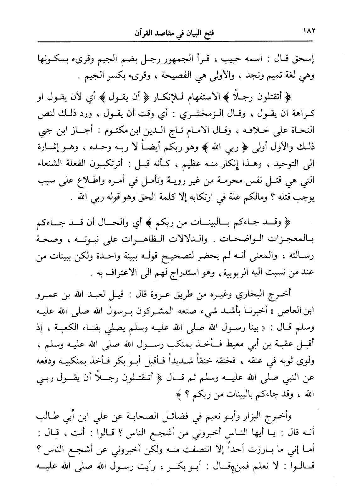 أخرج البخاري وغيره من طريق عروة قال: قيل لعبد الله بن عمرو ابن العاص " أخبرنا بأشد شيء صنعه المشركون برسول الله صلى الله عليه وسلم قال: " بينا رسول الله صلى الله عليه وسلم يصلي بفناء الكعبة، إذ أقبل عقبة بن أبي معيط فأخذ بمنكب رسول الله صلى الله عليه وسلم، ولوى ثوبه في عنقه، فخنقه خناقاً شديداً فأقبل أبو بكر فأخذ بمنكبيه ودفعه عن النبي صلى الله عليه وسلم ثم قال (أَتَقْتُلُونَ رَجُلًا أَنْ يَقُولَ رَبِّيَ اللَّهُ وَقَدْ جَاءَكُمْ بِالْبَيِّنَاتِ مِنْ رَبِّكُمْ)؟