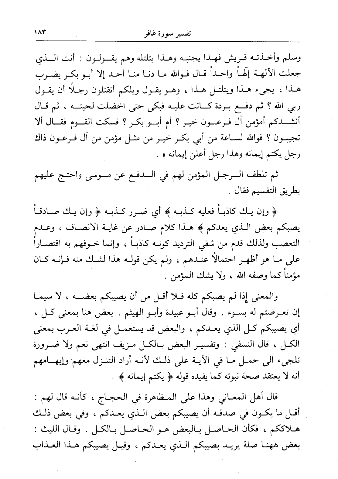 والمعنى إذا لم يصبكم كله فلا أقل من أن يصيبكم بعضه، لا سيما إن تعرضتم له بسوء. وقال أبو عبيدة وأبو الهيثم. بعض هنا بمعنى كل، أي يصيبكم كل الذي يعدكم، والبعض قد يستعمل في لغة العرب بمعنى الكل، قال النسفي: وتفسير البعض بالكل مزيف انتهى نعم ولا ضرورة تلجىء إلى حمل ما في الآية على ذلك لأنه أراد التنزل معهم وإيهامهم أنه لا يعتقد صحة نبوته كما يفيده قوله (يكتم إيمانه).