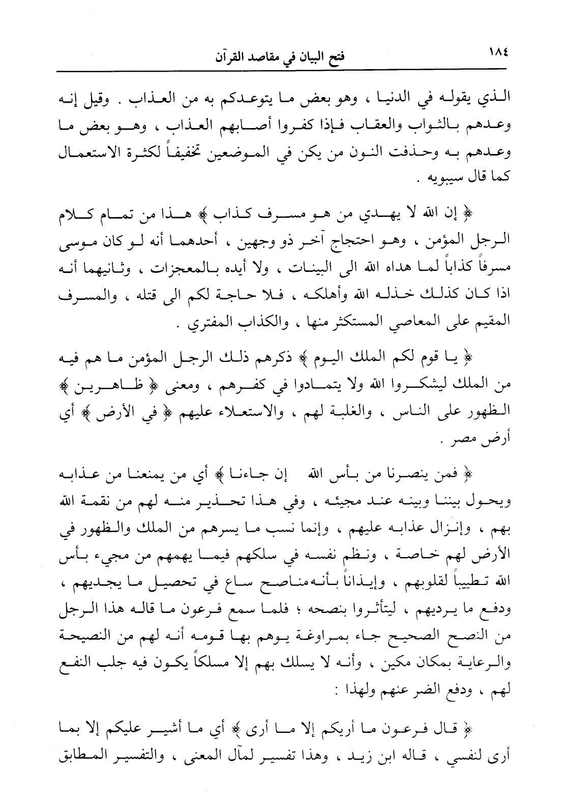(فمن ينصرنا من بأس الله إن جاءنا) أي من يمنعنا من عذابه ويحول بيننا وبينه عند مجيئه، وفي هذا تحذير منه لهم من نقمة الله بهم، وإنزال عذابه عليهم، وإنما نسب ما يسرهم من الملك والظهور في الأرض لهم خاصة، ونظم نفسه في سلكهم فيما يهمهم من مجيء بأس الله تطييباً لقلوبهم، وإيذاناً بأنه مناصح ساع في تحصيل ما يجديهم، ودفع ما يرديهم، ليتأثروا بنصحه؛ فلما سمع فرعون ما قاله هذا الرجل من النصح الصحيح جاء بمراوغة يوهم بها قومه أنه لهم من النصيحة والرعاية بمكان مكين، وأنه لا يسلك بهم إلا مسلكاً يكون فيه جلب النفع لهم، ودفع الضر عنهم ولهذا.