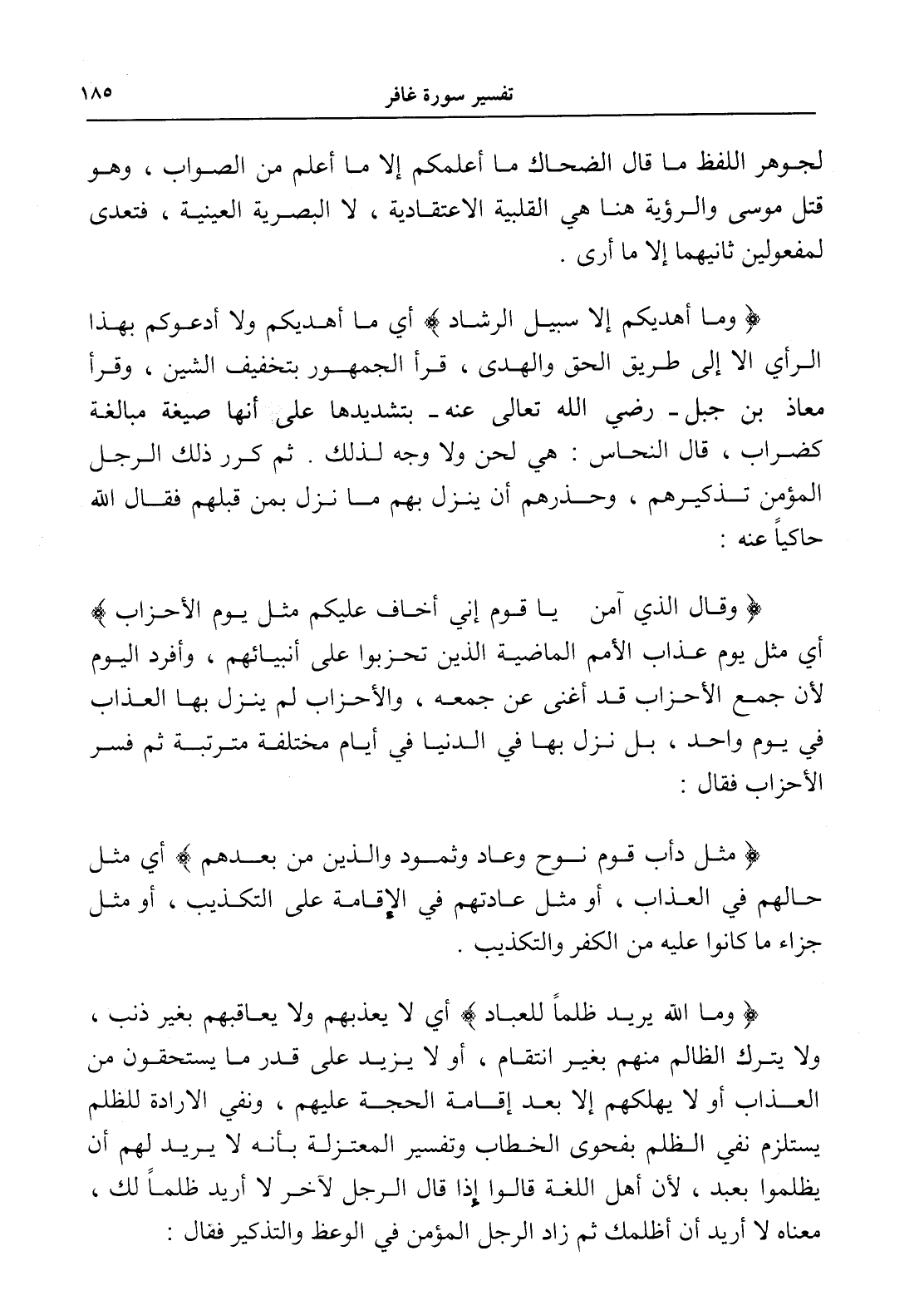 (وما الله يريد ظلماً للعباد) أي لا يعذبهم ولا يعاقبهم بغير ذنب، ولا يترك الظالم منهم بغير انتقام، أو لا يزيد على قدر ما يستحقون من العذاب أو لا يهلكهم إلا بعد إقامة الحجة عليهم، ونفي الإرادة للظلم يستلزم نفي الظلم بفحوى الخطاب وتفسير المعتزلة بأنه لا يريد لهم أن يظلموا بعبد، لأن أهل اللغة قالوا إذا قال الرجل لآخر لا أريد ظلماً لك، معناه لا أريد أن أظلمك ثم زاد الرجل المؤمن في الوعظ والتذكير فقال: