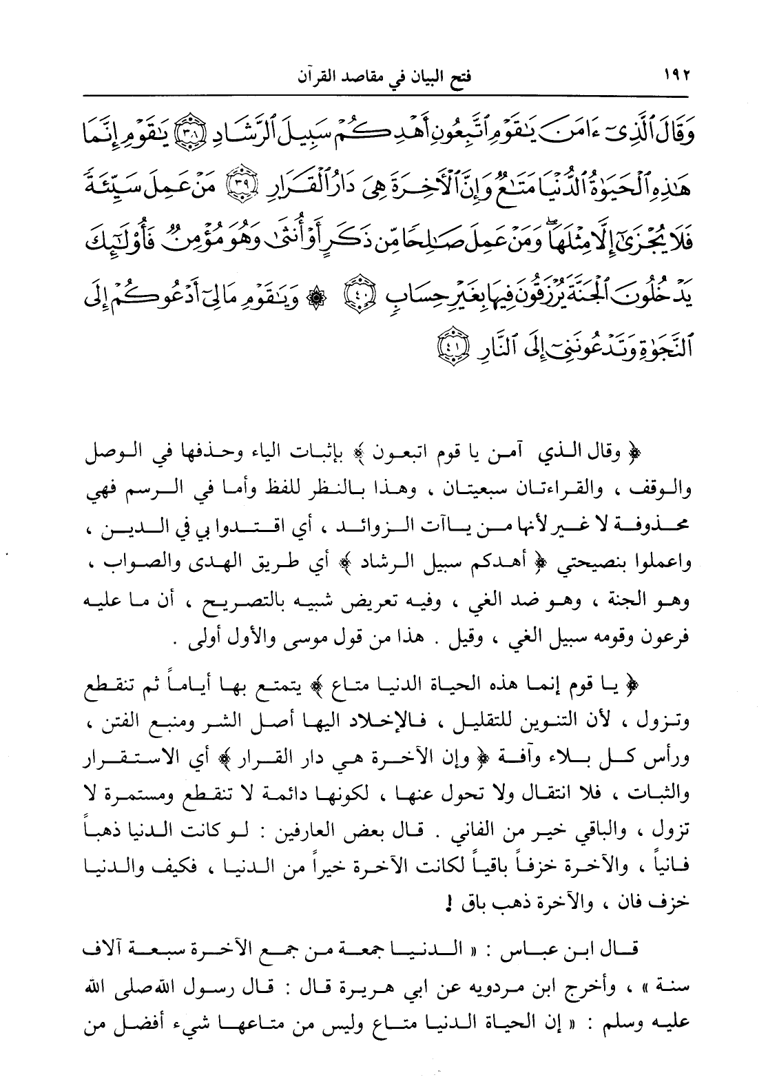 وَقَالَ الَّذِي آمَنَ يَا قَوْمِ اتَّبِعُونِ أَهْدِكُمْ سَبِيلَ الرَّشَادِ (38) يَا قَوْمِ إِنَّمَا هَذِهِ الْحَيَاةُ الدُّنْيَا مَتَاعٌ وَإِنَّ الْآخِرَةَ هِيَ دَارُ الْقَرَارِ (39) مَنْ عَمِلَ سَيِّئَةً فَلَا يُجْزَى إِلَّا مِثْلَهَا وَمَنْ عَمِلَ صَالِحًا مِنْ ذَكَرٍ أَوْ أُنْثَى وَهُوَ مُؤْمِنٌ فَأُولَئِكَ يَدْخُلُونَ الْجَنَّةَ يُرْزَقُونَ فِيهَا بِغَيْرِ حِسَابٍ (40) وَيَا قَوْمِ مَا لِي أَدْعُوكُمْ إِلَى النَّجَاةِ وَتَدْعُونَنِي إِلَى النَّارِ (41)