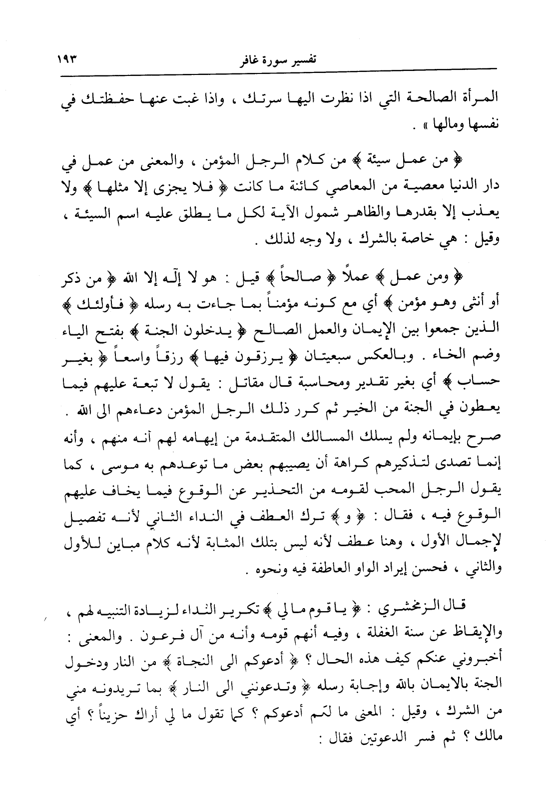 قال الزمخشري: (يا قوم ما لي) تكرير النداء لزيادة التنبيه لهم، والإيقاظ عن سنة الغفلة، وفيه أنهم قومه وأنه من آل فرعون. والمعنى: أخبروني عنكم كيف هذه الحال؟ (أدعوكم إلى النجاة) من النار ودخول الجنة بالإيمان بالله وإجابة رسله (وتدعونني إلى النار) بما تريدونه مني من الشرك، وقيل: المعنى ما لكم أدعوكم؟ كما تقول ما لي أراك حزيناً؟ أي مالك؟ ثم فسر الدعوتين فقال: