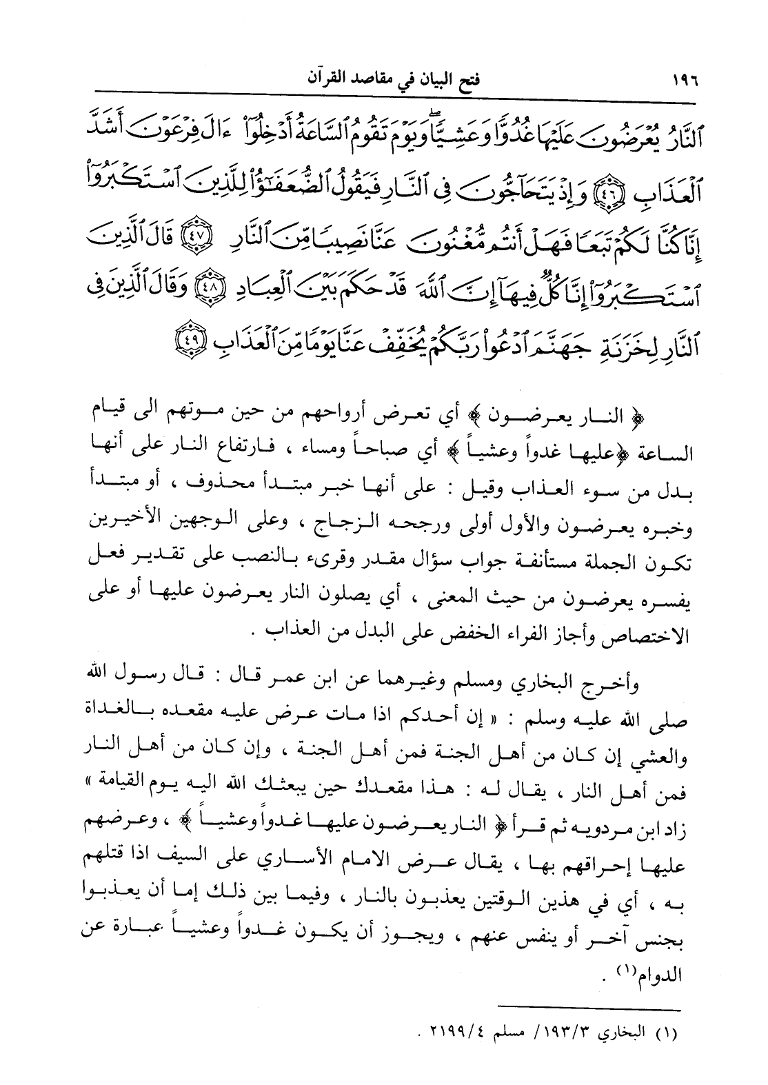 النَّارُ يُعْرَضُونَ عَلَيْهَا غُدُوًّا وَعَشِيًّا وَيَوْمَ تَقُومُ السَّاعَةُ أَدْخِلُوا آلَ فِرْعَوْنَ أَشَدَّ الْعَذَابِ (46) وَإِذْ يَتَحَاجُّونَ فِي النَّارِ فَيَقُولُ الضُّعَفَاءُ لِلَّذِينَ اسْتَكْبَرُوا إِنَّا كُنَّا لَكُمْ تَبَعًا فَهَلْ أَنْتُمْ مُغْنُونَ عَنَّا نَصِيبًا مِنَ النَّارِ (47) قَالَ الَّذِينَ اسْتَكْبَرُوا إِنَّا كُلٌّ فِيهَا إِنَّ اللَّهَ قَدْ حَكَمَ بَيْنَ الْعِبَادِ (48) وَقَالَ الَّذِينَ فِي النَّارِ لِخَزَنَةِ جَهَنَّمَ ادْعُوا رَبَّكُمْ يُخَفِّفْ عَنَّا يَوْمًا مِنَ الْعَذَابِ (49)