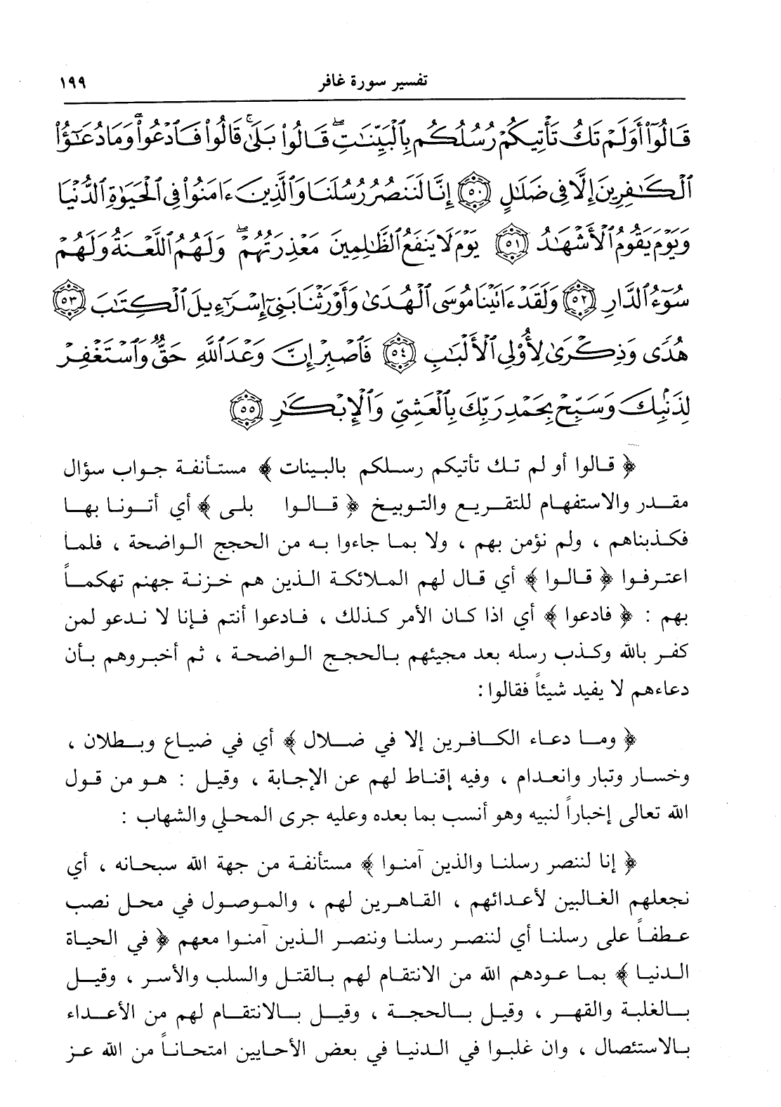 قَالُوا أَوَلَمْ تَكُ تَأْتِيكُمْ رُسُلُكُمْ بِالْبَيِّنَاتِ قَالُوا بَلَى قَالُوا فَادْعُوا وَمَا دُعَاءُ الْكَافِرِينَ إِلَّا فِي ضَلَالٍ (50) إِنَّا لَنَنْصُرُ رُسُلَنَا وَالَّذِينَ آمَنُوا فِي الْحَيَاةِ الدُّنْيَا وَيَوْمَ يَقُومُ الْأَشْهَادُ (51) يَوْمَ لَا يَنْفَعُ الظَّالِمِينَ مَعْذِرَتُهُمْ وَلَهُمُ اللَّعْنَةُ وَلَهُمْ سُوءُ الدَّارِ (52) وَلَقَدْ آتَيْنَا مُوسَى الْهُدَى وَأَوْرَثْنَا بَنِي إِسْرَائِيلَ الْكِتَابَ (53) هُدًى وَذِكْرَى لِأُولِي الْأَلْبَابِ (54) فَاصْبِرْ إِنَّ وَعْدَ اللَّهِ حَقٌّ وَاسْتَغْفِرْ لِذَنْبِكَ وَسَبِّحْ بِحَمْدِ رَبِّكَ بِالْعَشِيِّ وَالْإِبْكَارِ (55)