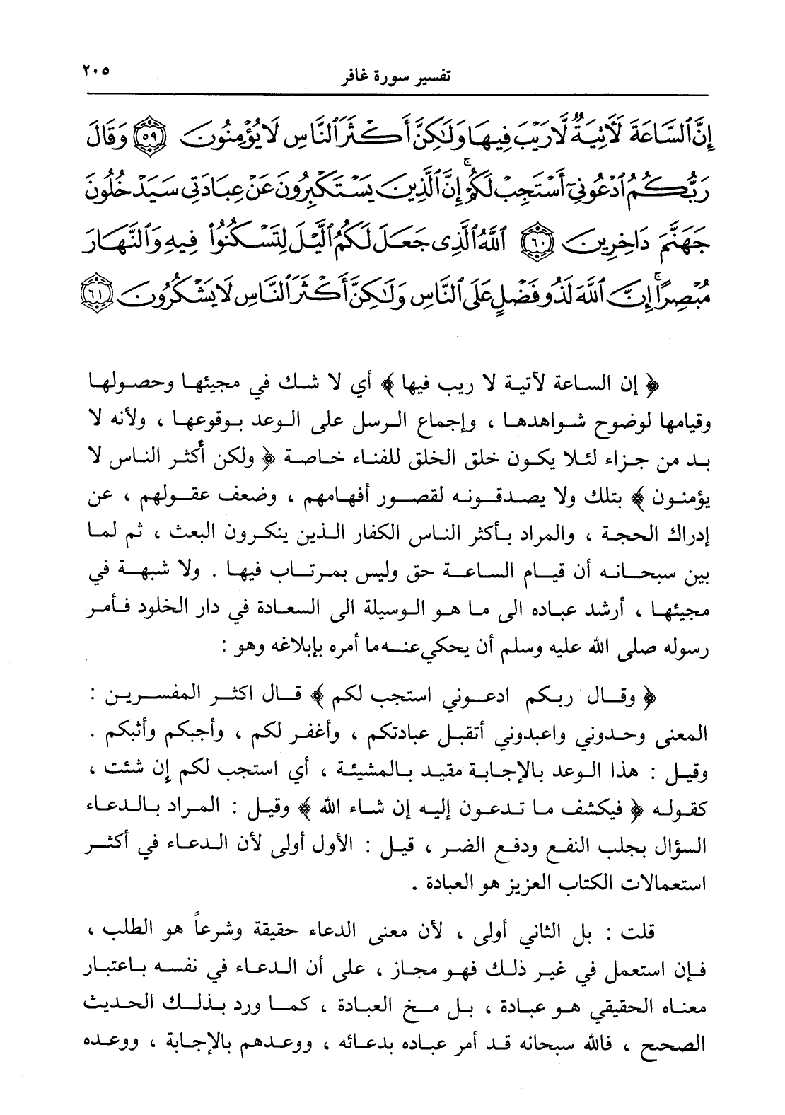 إِنَّ السَّاعَةَ لَآتِيَةٌ لَا رَيْبَ فِيهَا وَلَكِنَّ أَكْثَرَ النَّاسِ لَا يُؤْمِنُونَ (59) وَقَالَ رَبُّكُمُ ادْعُونِي أَسْتَجِبْ لَكُمْ إِنَّ الَّذِينَ يَسْتَكْبِرُونَ عَنْ عِبَادَتِي سَيَدْخُلُونَ جَهَنَّمَ دَاخِرِينَ (60) اللَّهُ الَّذِي جَعَلَ لَكُمُ اللَّيْلَ لِتَسْكُنُوا فِيهِ وَالنَّهَارَ مُبْصِرًا إِنَّ اللَّهَ لَذُو فَضْلٍ عَلَى النَّاسِ وَلَكِنَّ أَكْثَرَ النَّاسِ لَا يَشْكُرُونَ (61)