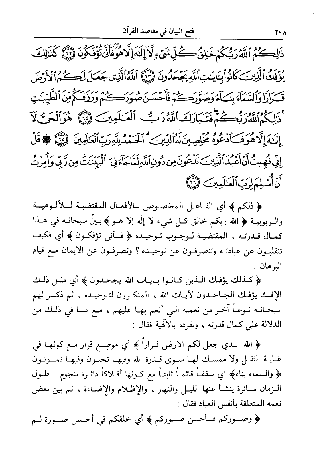 ذَلِكُمُ اللَّهُ رَبُّكُمْ خَالِقُ كُلِّ شَيْءٍ لَا إِلَهَ إِلَّا هُوَ فَأَنَّى تُؤْفَكُونَ (62) كَذَلِكَ يُؤْفَكُ الَّذِينَ كَانُوا بِآيَاتِ اللَّهِ يَجْحَدُونَ (63) اللَّهُ الَّذِي جَعَلَ لَكُمُ الْأَرْضَ قَرَارًا وَالسَّمَاءَ بِنَاءً وَصَوَّرَكُمْ فَأَحْسَنَ صُوَرَكُمْ وَرَزَقَكُمْ مِنَ الطَّيِّبَاتِ ذَلِكُمُ اللَّهُ رَبُّكُمْ فَتَبَارَكَ اللَّهُ رَبُّ الْعَالَمِينَ (64) هُوَ الْحَيُّ لَا إِلَهَ إِلَّا هُوَ فَادْعُوهُ مُخْلِصِينَ لَهُ الدِّينَ الْحَمْدُ لِلَّهِ رَبِّ الْعَالَمِينَ (65) قُلْ إِنِّي نُهِيتُ أَنْ أَعْبُدَ الَّذِينَ تَدْعُونَ مِنْ دُونِ اللَّهِ لَمَّا جَاءَنِيَ الْبَيِّنَاتُ مِنْ رَبِّي وَأُمِرْتُ أَنْ أُسْلِمَ لِرَبِّ الْعَالَمِينَ (66)