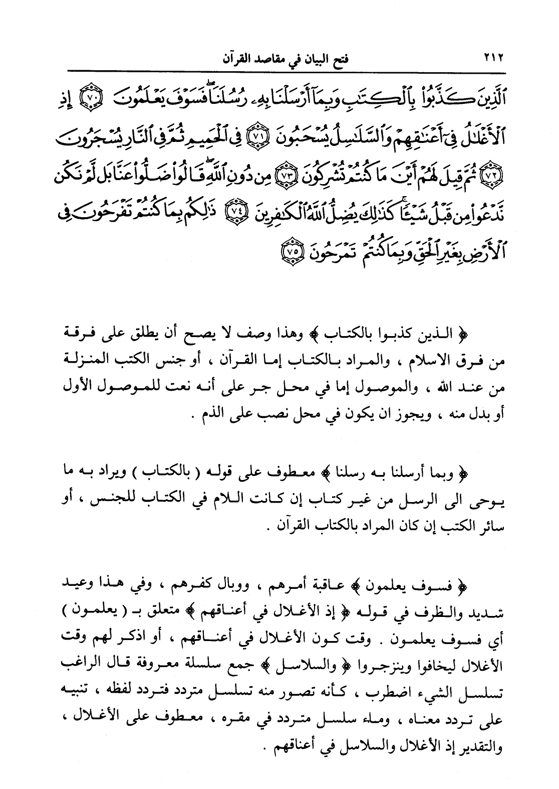 الَّذِينَ كَذَّبُوا بِالْكِتَابِ وَبِمَا أَرْسَلْنَا بِهِ رُسُلَنَا فَسَوْفَ يَعْلَمُونَ (70) إِذِ الْأَغْلَالُ فِي أَعْنَاقِهِمْ وَالسَّلَاسِلُ يُسْحَبُونَ (71) فِي الْحَمِيمِ ثُمَّ فِي النَّارِ يُسْجَرُونَ (72) ثُمَّ قِيلَ لَهُمْ أَيْنَ مَا كُنْتُمْ تُشْرِكُونَ (73) مِنْ دُونِ اللَّهِ قَالُوا ضَلُّوا عَنَّا بَلْ لَمْ نَكُنْ نَدْعُو مِنْ قَبْلُ شَيْئًا كَذَلِكَ يُضِلُّ اللَّهُ الْكَافِرِينَ (74) ذَلِكُمْ بِمَا كُنْتُمْ تَفْرَحُونَ فِي الْأَرْضِ بِغَيْرِ الْحَقِّ وَبِمَا كُنْتُمْ تَمْرَحُونَ (75)