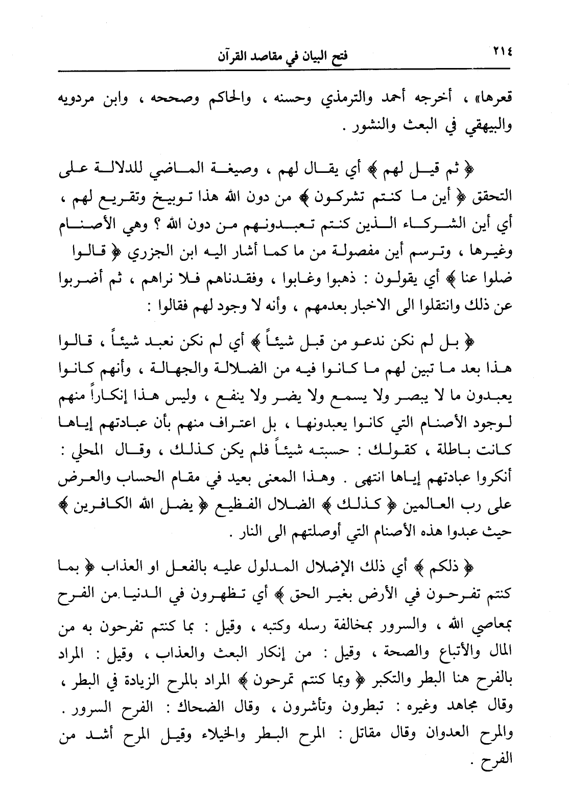(ذلكم) أي ذلك الإضلال المدلول عليه بالفعل أو العذاب (بما كنتم تفرحون في الأرض بغير الحق) أي تظهرون في الدنيا. من الفرح بمعاصي الله، والسرور بمخالفة رسله وكتبه، وقيل: بما كنتم تفرحون به من المال والأتباع والصحة، وقيل: من إنكار البعث والعذاب، وقيل: المراد بالفرح هنا البطر والتكبر (وبما كنتم تمرحون) المراد بالمرح الزيادة في البطر، وقال مجاهد وغيره: تبطرون وتأشرون، وقال الضحاك: الفرح السرور. والمرح العدوان وقال مقاتل: المرح البطر والخيلاء وقيل المرح أشد من الفرح.