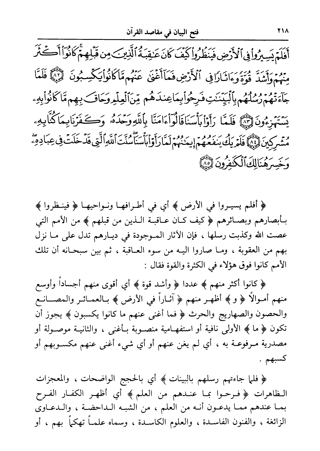 أَفَلَمْ يَسِيرُوا فِي الْأَرْضِ فَيَنْظُرُوا كَيْفَ كَانَ عَاقِبَةُ الَّذِينَ مِنْ قَبْلِهِمْ كَانُوا أَكْثَرَ مِنْهُمْ وَأَشَدَّ قُوَّةً وَآثَارًا فِي الْأَرْضِ فَمَا أَغْنَى عَنْهُمْ مَا كَانُوا يَكْسِبُونَ (82) فَلَمَّا جَاءَتْهُمْ رُسُلُهُمْ بِالْبَيِّنَاتِ فَرِحُوا بِمَا عِنْدَهُمْ مِنَ الْعِلْمِ وَحَاقَ بِهِمْ مَا كَانُوا بِهِ يَسْتَهْزِئُونَ (83) فَلَمَّا رَأَوْا بَأْسَنَا قَالُوا آمَنَّا بِاللَّهِ وَحْدَهُ وَكَفَرْنَا بِمَا كُنَّا بِهِ مُشْرِكِينَ (84) فَلَمْ يَكُ يَنْفَعُهُمْ إِيمَانُهُمْ لَمَّا رَأَوْا بَأْسَنَا سُنَّتَ اللَّهِ الَّتِي قَدْ خَلَتْ فِي عِبَادِهِ وَخَسِرَ هُنَالِكَ الْكَافِرُونَ (85)
