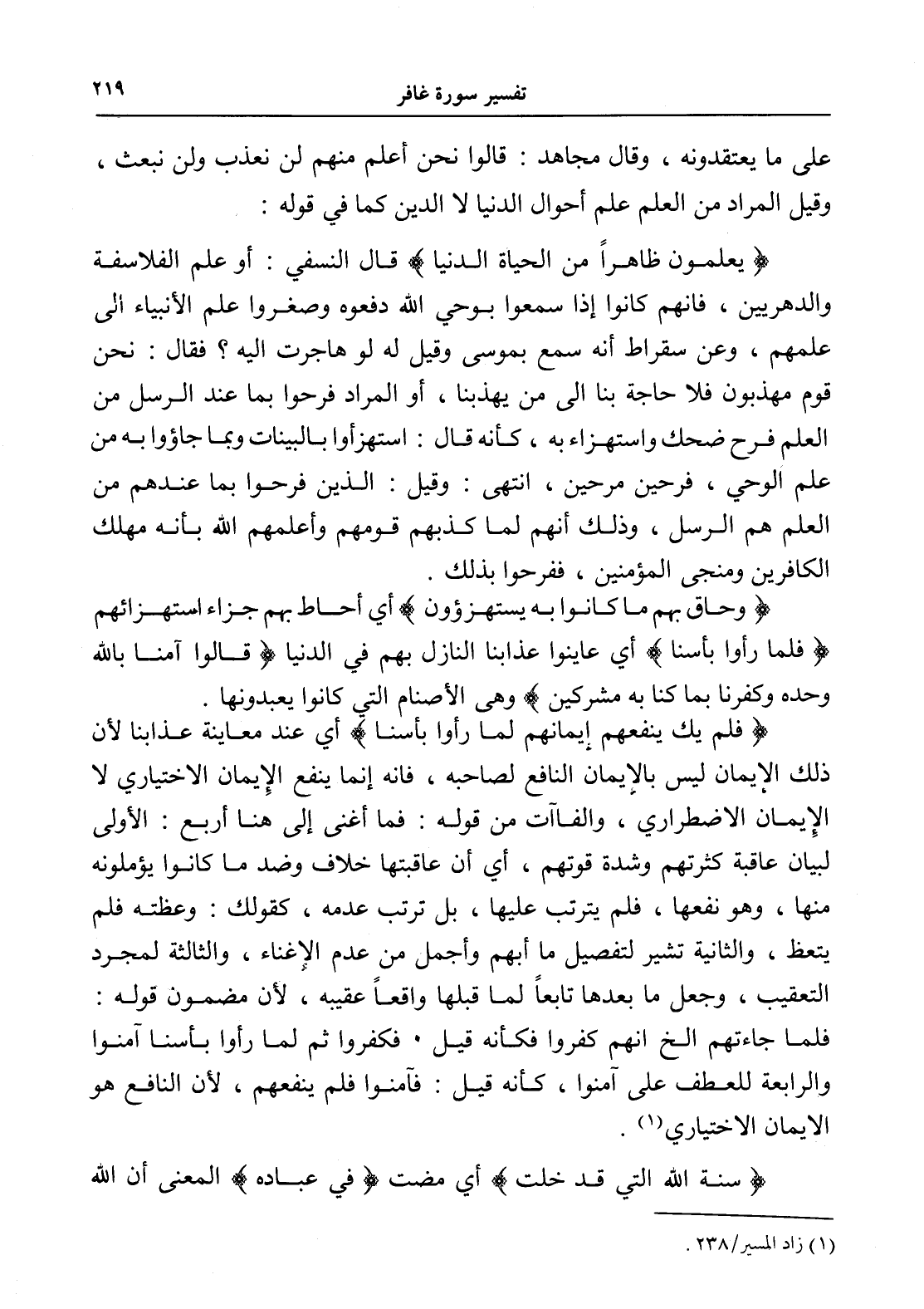 (فلم يك ينفعهم إيمانهم لما رأوا بأسنا) أي عند معاينة عذابنا لأن ذلك الإيمان ليس بالإيمان النافع لصاحبه، فإنه إنما ينفع الإِيمان الاختياري لا الإِيمان الاضطراري، والفاآت من قوله: فما أغنى إلى هنا أربع: الأولى لبيان عاقبة كثرتهم وشدة قوتهم، أي أن عاقبتها خلاف وضد ما كانوا يؤملونه منها، وهو نفعها، فلم يترتب عليها، بل ترتب عدمه، كقولك: وعظته فلم يتعظ، والثانية تشير لتفصيل ما أبهم وأجمل من عدم الإغناء، والثالثة لمجرد التعقيب، وجعل ما بعدها تابعاً لما قبلها واقعاً عقيبه، لأن مضمون قوله: فلما جاءتهم الخ أنهم كفروا فكأنه قيل فكفروا ثم لما رأوا بأسنا آمنوا والرابعة للعطف على آمنوا، كأنه قيل: فآمنوا فلم ينفعهم، لأن النافع هو الإيمان الاختياري (¬1).