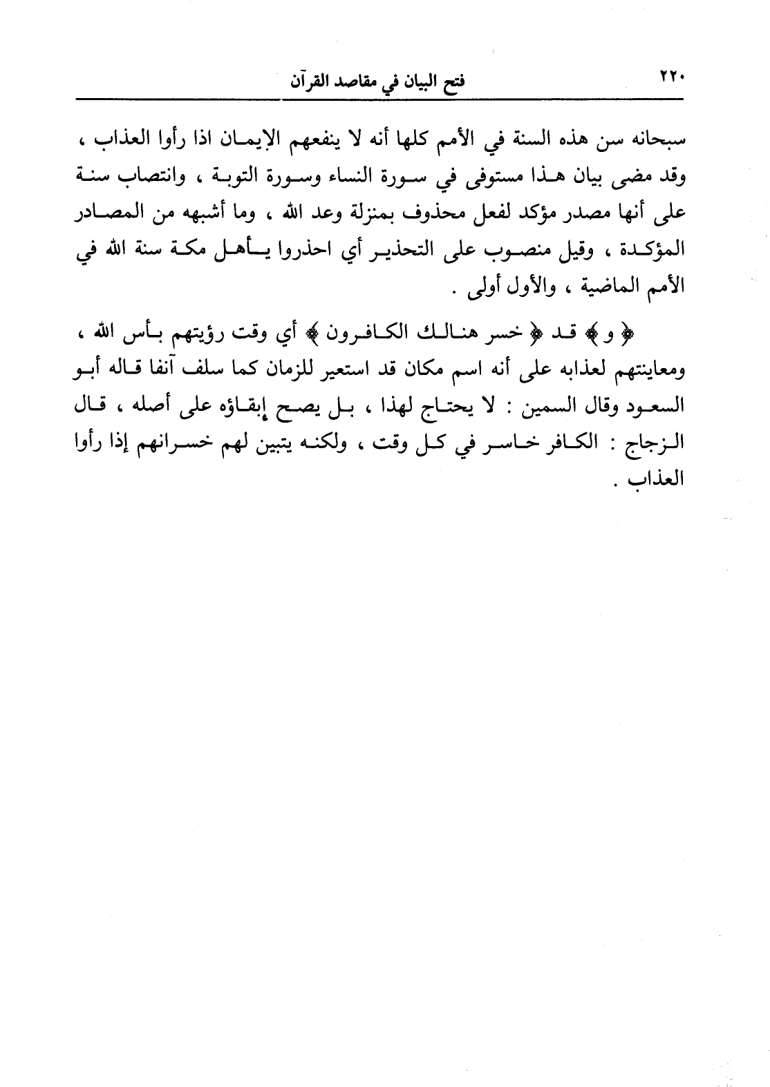 سبحانه سن هذه السنة في الأمم كلها أنه لا ينفعهم الإيمان إذا رأوا العذاب، وقد مضى بيان هذا مستوفى في سورة النساء وسورة التوبة، وانتصاب سنة على أنها مصدر مؤكد لفعل محذوف بمنزلة وعد الله، وما أشبهه من المصادر المؤكدة، وقيل منصوب على التحذير أي احذروا يأهل مكة سنة الله في الأمم الماضية، والأول أولى.