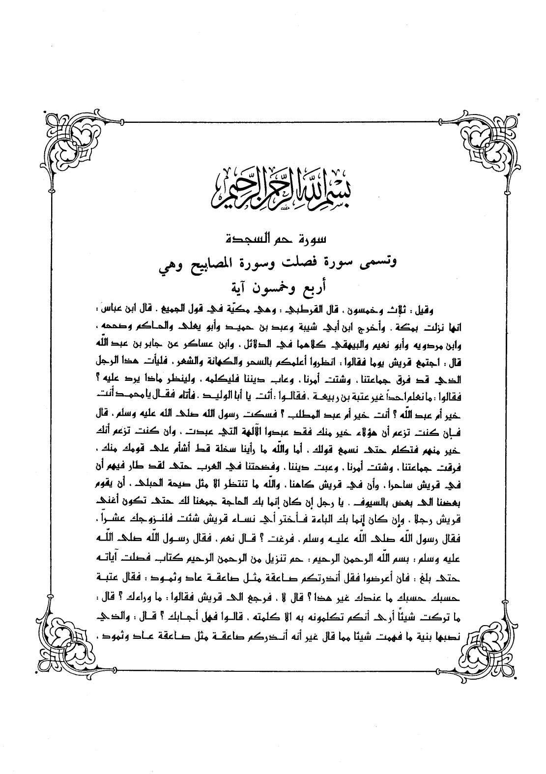 وقيل: ثلاث وخمسون، قال القرطبي: وهي مكيّة في قول الجميع، قال ابن عباس: أنها نزلت بمكة، وأخرج ابن أبي شيبة وعبد بن حميد وأبو يعلى والحاكم وصححه، وابن مردويه وأبو نعيم والبيهقي كلاهما في الدلائل، وابن عساكر عن جابر بن عبد الله قال: اجتمع قريش يوماً فقالوا: انظروا أعلمكم بالسحر والكهانة والشعر، فليأت هذا الرجل الذي قد فرق جماعتنا، وشتت أمرنا. وعاب ديننا فليكلمه، ولينظر ماذا يرد عليه؟ فقالوا: ما نعلم أحداً غير عتبة بن ربيعة، فقالوا: ائت يا أبا الوليد، فأتاه فقال يا محمد أنت خير أم عبد الله؟ أنت خير أم عبد المطلب؟ فسكت رسول الله - صلى الله عليه وسلم -، قال فإن كنت تزعم أن هؤلاء خير منك فقد عبدوا الآلهة التي عبدت، وإن كنت تزعم أنك خير منهم فتكلم حتى نسمع قولك، أما والله ما رأينا سخلة قط أشأم على قومك منك، فرقت جماعتنا، وشتت أمرنا، وعبت ديننا، وفضحتنا في العرب حتى لقد طار فيهم أن في قريش ساحراً، وأن في قريش كاهناً، والله ما تنتظر إلا مثل صيحة الحبلي، أن يقوم بعضنا إلى بعض بالسيوف، يا رجل إن كان إنما بك الحاجة جمعنا لك حتى تكون أغنى قريش رجلاً، وإن كان إنما بك الباءة فاختر أي نساء قريش شئت فلنزوجك عشراً، فقال رسول الله - صلى الله عليه وسلم -، " فرغت "؟ قال نعم، فقال رسول الله - صلى الله عليه وسلم -: " بسم الله الرحمن الرحيم: (حم * تَنْزِيلٌ مِنَ الرَّحْمَنِ الرَّحِيمِ * كِتَابٌ فُصِّلَتْ آيَاتُهُ) حتى بلغ: (فَإِنْ أَعْرَضُوا فَقُلْ أَنْذَرْتُكُمْ صَاعِقَةً مِثْلَ صَاعِقَةِ عَادٍ وَثَمُودَ): فقال عتبة حسبك حسبك ما عندك غير هذا؟ قال: " لا "، فرجع إلى قريش فقالوا: ما وراءك؟ قال: ما تركت شيئاً أرى أنكم تكلمونه به إلا كلمته، قالوا فهل أجابك؟ قال: والذي نصبها بنية ما فهمت شيئاً مما قال غير أنه أنذركم صاعقة مثل صاعقة عاد وثمود.