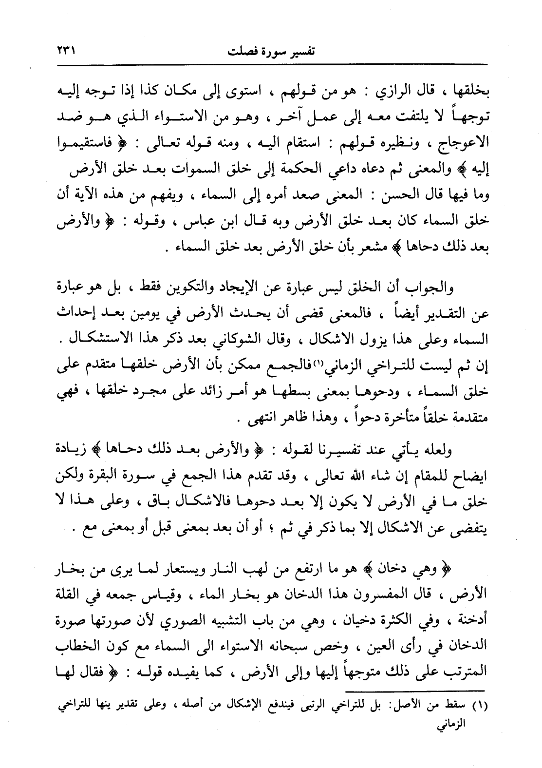 إن ثم ليست للتراخي الزماني (¬1) فالجمع ممكن بأن الأرض خلقها متقدم على خلق السماء، ودحوها بمعنى بسطها هو أمر زائد على مجرد خلقها، فهي متقدمة خلقاً متأخرة دحواً، وهذا ظاهر انتهى.