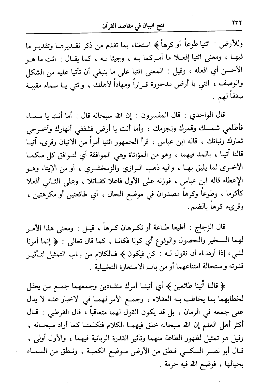 قال الواحدي: قال المفسرون: إن الله سبحانه قال: أما أنت يا سماء فأطلعي شمسك وقمرك ونجومك، وأما أنت يا أرض فشققي أنهارك وأخرجي ثمارك ونباتك، قاله ابن عباس، قرأ الجمهور ائتيا أمراً من الإتيان وقرىء آتيا قالتا آتينا، بالمد فيهما، وهو من المؤاتاة وهي الموافقة أي لتوافق كل منكما الأخرى لما يليق بها، وإليه ذهب الرازي والزمخشري، أو من الإيتاء وهو الإِعطاء قاله ابن عباس، فوزنه على الأول فاعلا كقاتلا، وعلى الثاني أفعلا كأكرما، وطوعاً وكرهاً مصدران في موضع الحال، أي طائعتين أو مكرهتين، وقرىء كرهاً بالضم.