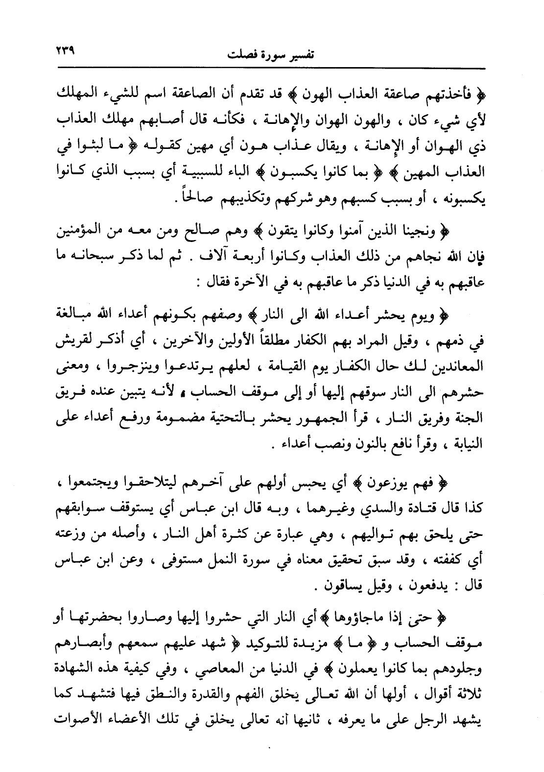 (فَأَخَذَتْهُمْ صَاعِقَةُ الْعَذَابِ الْهُونِ) قد تقدم أن الصاعقة اسم للشيء المهلك لأي شيء كان، والهون الهوان والإهانة، فكأنه قال أصابهم مهلك العذاب ذي الهوان أو الإِهانة، ويقال عذاب هون أي مهين كقوله (ما لبثوا في العذاب المهين) (بما كانوا يكسبون) الباء للسببية أي بسبب الذي كانوا يكسبونه، أو بسبب كسبهم وهو شركهم وتكذيبهم صالحاً.