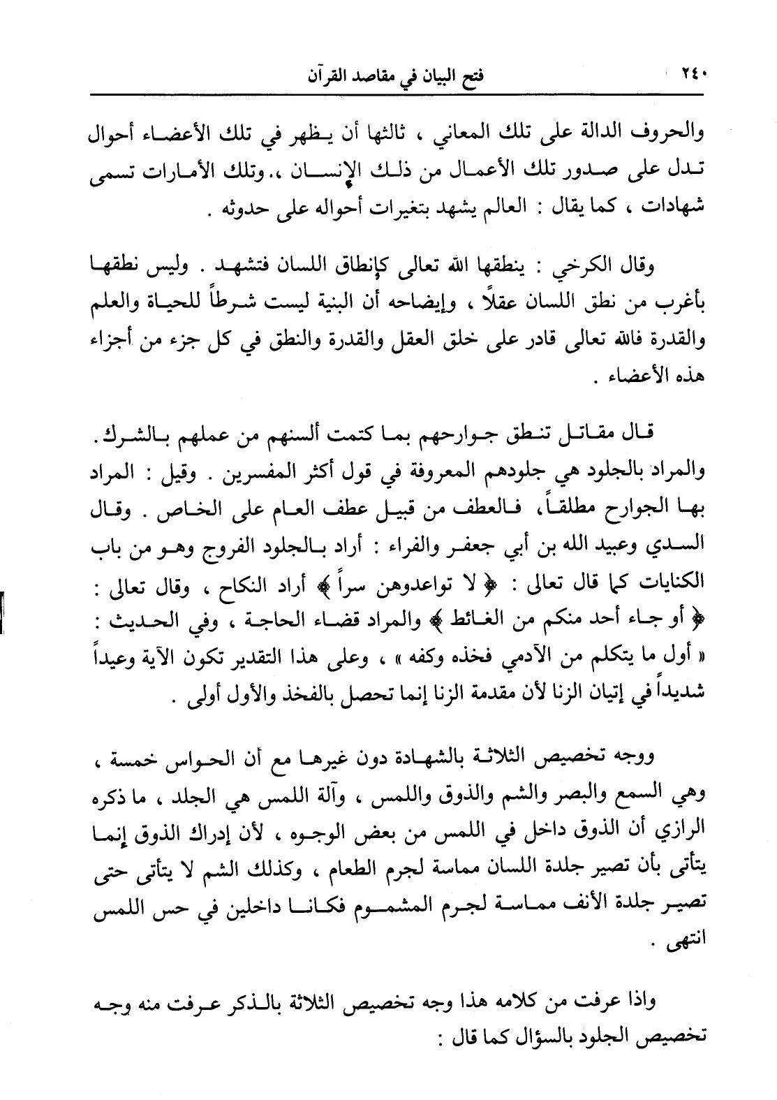 ووجه تخصيص الثلاثة بالشهادة دون غيرها مع أن الحواس خمسة، وهي السمع والبصر والشم والذوق واللمس، وآلة اللمس هي الجلد، ما ذكره الرازي أن الذوق داخل في اللمس من بعض الوجوه، لأن إدراك الذوق إنما يتأتى بأن تصير جلدة اللسان مماسة لجرم الطعام، وكذلك الشم لا يتأتى حتى تصير جلدة الأنف مماسة لجرم المشموم فكانا داخلين في حس اللمس انتهى.