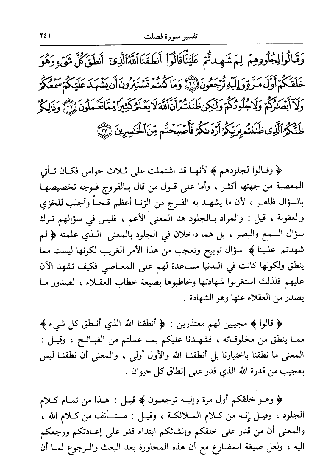 وَقَالُوا لِجُلُودِهِمْ لِمَ شَهِدْتُمْ عَلَيْنَا قَالُوا أَنْطَقَنَا اللَّهُ الَّذِي أَنْطَقَ كُلَّ شَيْءٍ وَهُوَ خَلَقَكُمْ أَوَّلَ مَرَّةٍ وَإِلَيْهِ تُرْجَعُونَ (21) وَمَا كُنْتُمْ تَسْتَتِرُونَ أَنْ يَشْهَدَ عَلَيْكُمْ سَمْعُكُمْ وَلَا أَبْصَارُكُمْ وَلَا جُلُودُكُمْ وَلَكِنْ ظَنَنْتُمْ أَنَّ اللَّهَ لَا يَعْلَمُ كَثِيرًا مِمَّا تَعْمَلُونَ (22) وَذَلِكُمْ ظَنُّكُمُ الَّذِي ظَنَنْتُمْ بِرَبِّكُمْ أَرْدَاكُمْ فَأَصْبَحْتُمْ مِنَ الْخَاسِرِينَ (23)