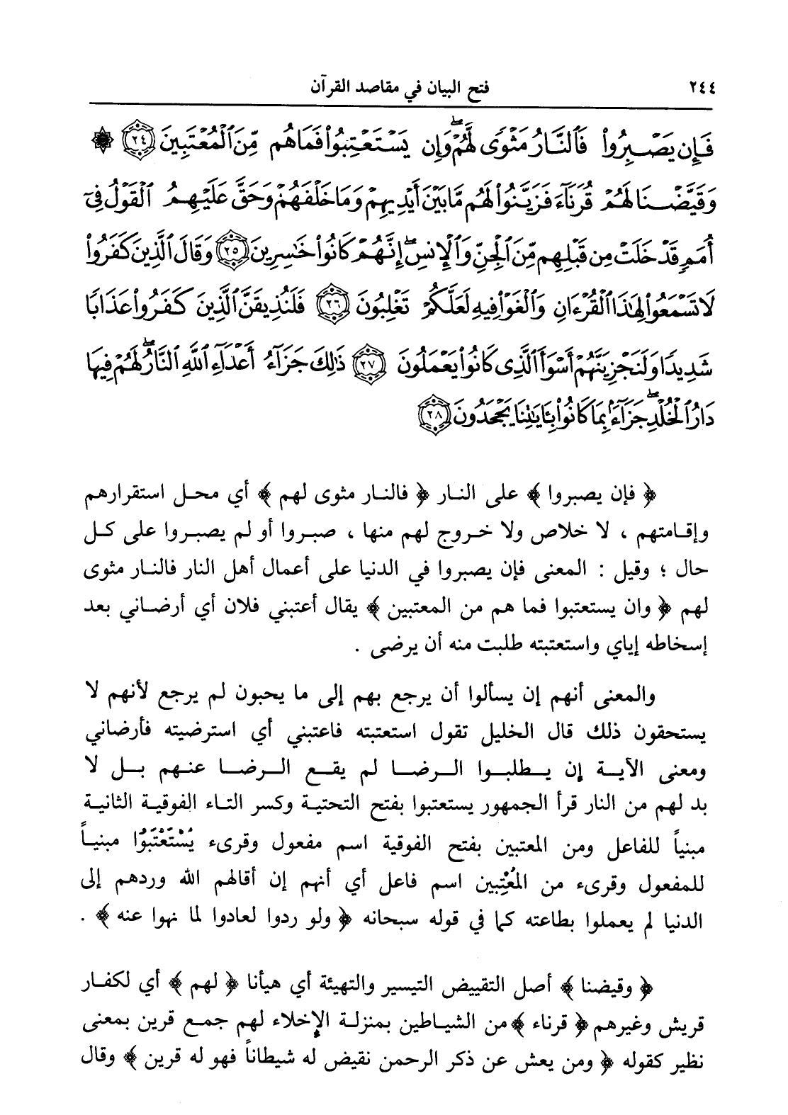 فَإِنْ يَصْبِرُوا فَالنَّارُ مَثْوًى لَهُمْ وَإِنْ يَسْتَعْتِبُوا فَمَا هُمْ مِنَ الْمُعْتَبِينَ (24) وَقَيَّضْنَا لَهُمْ قُرَنَاءَ فَزَيَّنُوا لَهُمْ مَا بَيْنَ أَيْدِيهِمْ وَمَا خَلْفَهُمْ وَحَقَّ عَلَيْهِمُ الْقَوْلُ فِي أُمَمٍ قَدْ خَلَتْ مِنْ قَبْلِهِمْ مِنَ الْجِنِّ وَالْإِنْسِ إِنَّهُمْ كَانُوا خَاسِرِينَ (25) وَقَالَ الَّذِينَ كَفَرُوا لَا تَسْمَعُوا لِهَذَا الْقُرْآنِ وَالْغَوْا فِيهِ لَعَلَّكُمْ تَغْلِبُونَ (26) فَلَنُذِيقَنَّ الَّذِينَ كَفَرُوا عَذَابًا شَدِيدًا وَلَنَجْزِيَنَّهُمْ أَسْوَأَ الَّذِي كَانُوا يَعْمَلُونَ (27) ذَلِكَ جَزَاءُ أَعْدَاءِ اللَّهِ النَّارُ لَهُمْ فِيهَا دَارُ الْخُلْدِ جَزَاءً بِمَا كَانُوا بِآيَاتِنَا يَجْحَدُونَ (28)