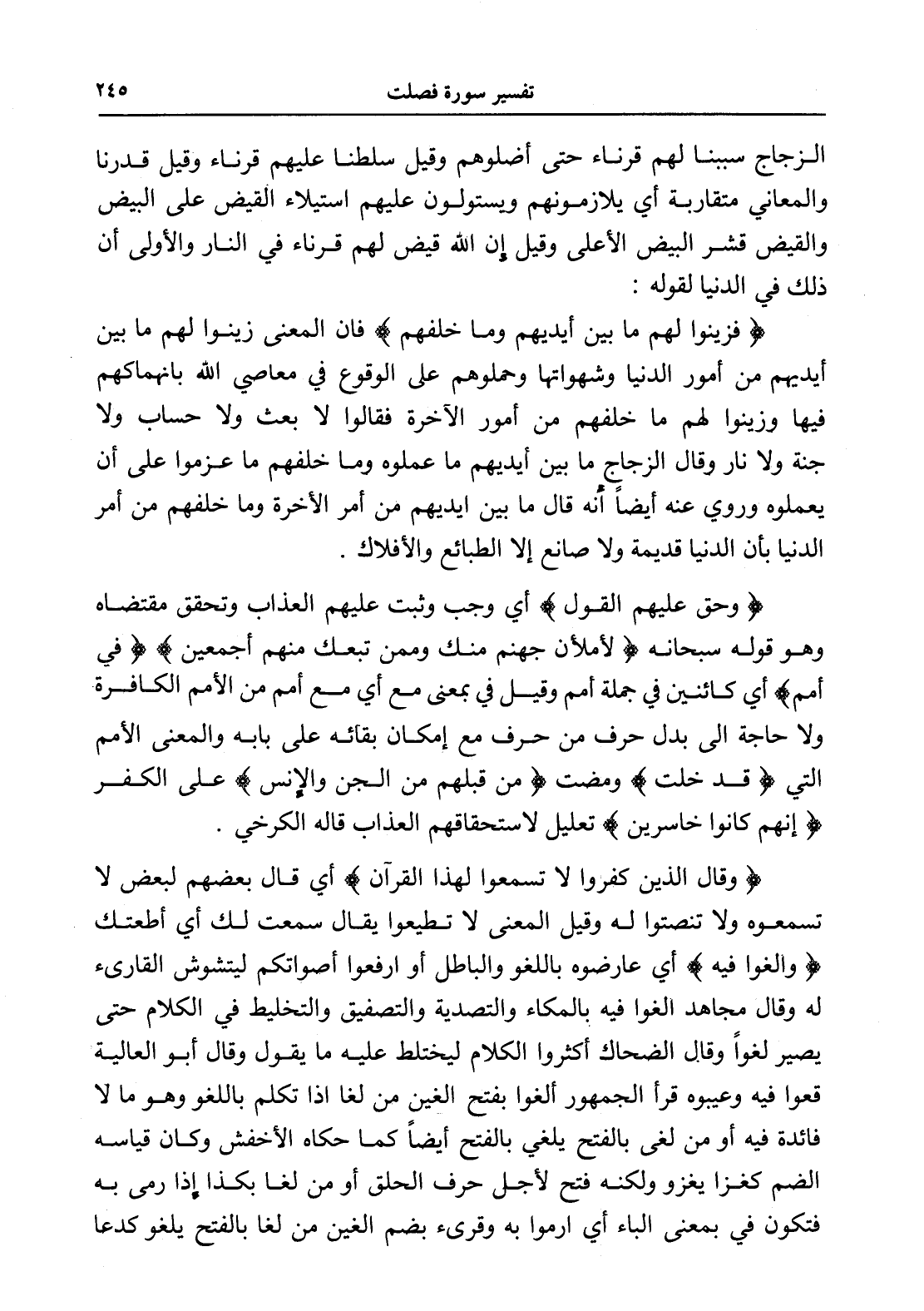 (وقال الذين كفروا لا تسمعوا لهذا القرآن) أي قال بعضهم لبعض لا تسمعوه ولا تنصتوا له وقيل المعنى لا تطيعوا يقال سمعت لك أي أطعتك (وَالْغَوْا فِيهِ) أي عارضوه باللغو والباطل أو ارفعوا أصواتكم ليتشوش القارىء له وقال مجاهد الغوا فيه بالمكاء والتصدية والتصفيق والتخليط في الكلام حتى يصير لغواً وقال الضحاك أكثروا الكلام ليختلط عليه ما يقول وقال أبو العالية قعوا فيه وعيبوه قرأ الجمهور ألغوا بفتح الغين من لغا إذا تكلم باللغو وهو ما لا فائدة فيه أو من لغى بالفتح يلغي بالفتح أيضاًً كما حكاه الأخفش وكان قياسه الضم كغزا يغزو ولكنه فتح لأجل حرف الحلق أو من لغا بكذا إذا رمى به فتكون في بمعنى الباء أي ارموا به وقرىء بضم الغين من لغا بالفتح يلغو كدعا