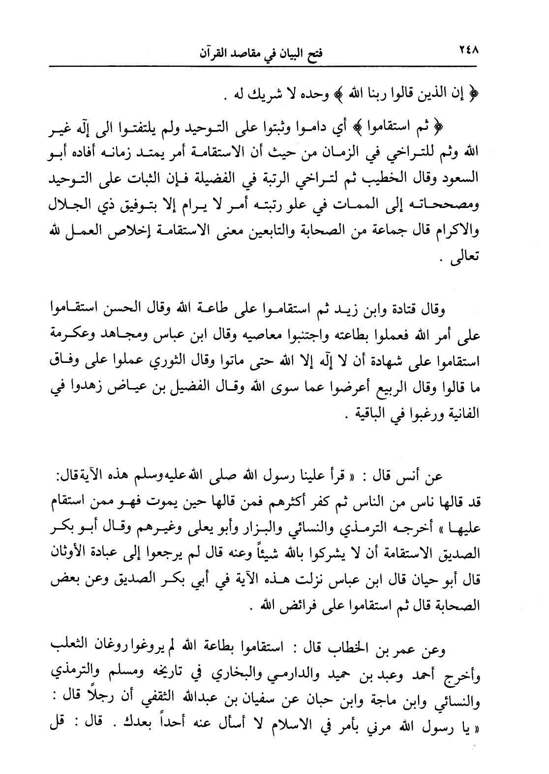 عن أنس قال: " قرأ علينا رسول الله صلى الله عليه وسلم هذه الآية قال: قد قالها ناس من الناس ثم كفر أكثرهم فمن قالها حين يموت فهو ممن استقام عليها " أخرجه الترمذي والنسائي والبزار وأبو يعلى وغيرهم وقال أبو بكر الصديق الاستقامة أن لا يشركوا بالله شيئاً وعنه قال لم يرجعوا إلى عبادة الأوثان قال أبو حيان قال ابن عباس نزلت هذه الآية في أبي بكر الصديق وعن بعض الصحابة قال ثم استقاموا على فرائض الله.