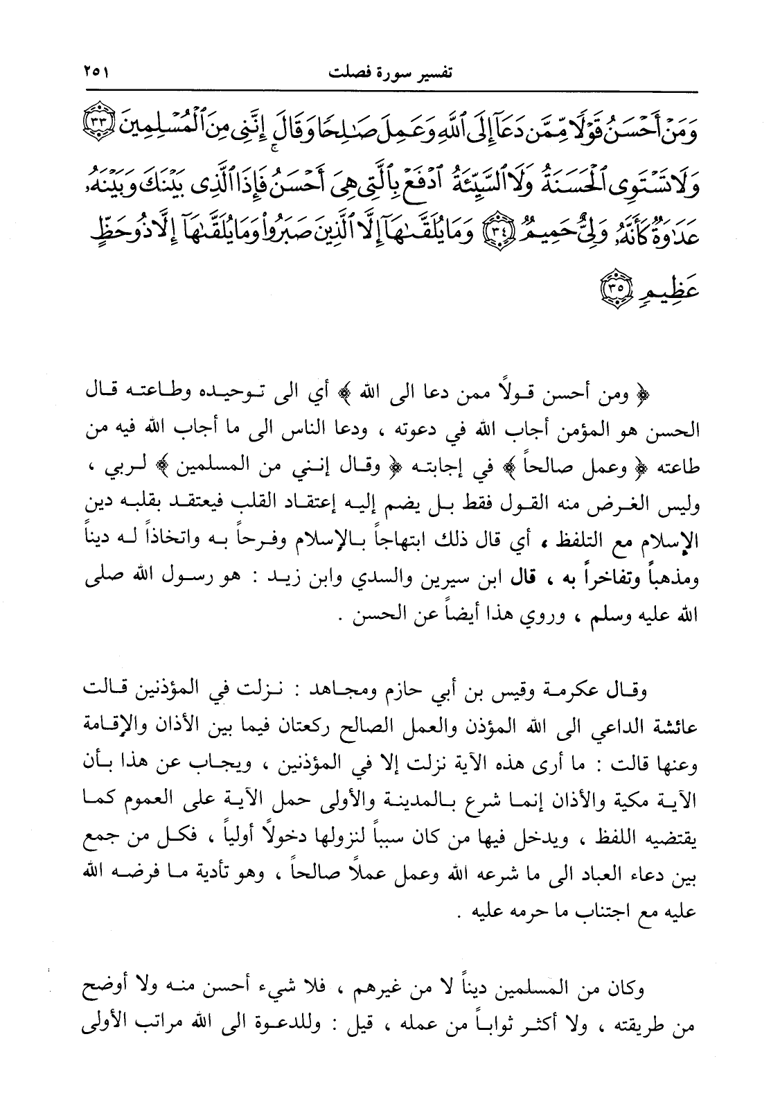 وَمَنْ أَحْسَنُ قَوْلًا مِمَّنْ دَعَا إِلَى اللَّهِ وَعَمِلَ صَالِحًا وَقَالَ إِنَّنِي مِنَ الْمُسْلِمِينَ (33) وَلَا تَسْتَوِي الْحَسَنَةُ وَلَا السَّيِّئَةُ ادْفَعْ بِالَّتِي هِيَ أَحْسَنُ فَإِذَا الَّذِي بَيْنَكَ وَبَيْنَهُ عَدَاوَةٌ كَأَنَّهُ وَلِيٌّ حَمِيمٌ (34) وَمَا يُلَقَّاهَا إِلَّا الَّذِينَ صَبَرُوا وَمَا يُلَقَّاهَا إِلَّا ذُو حَظٍّ عَظِيمٍ (35)