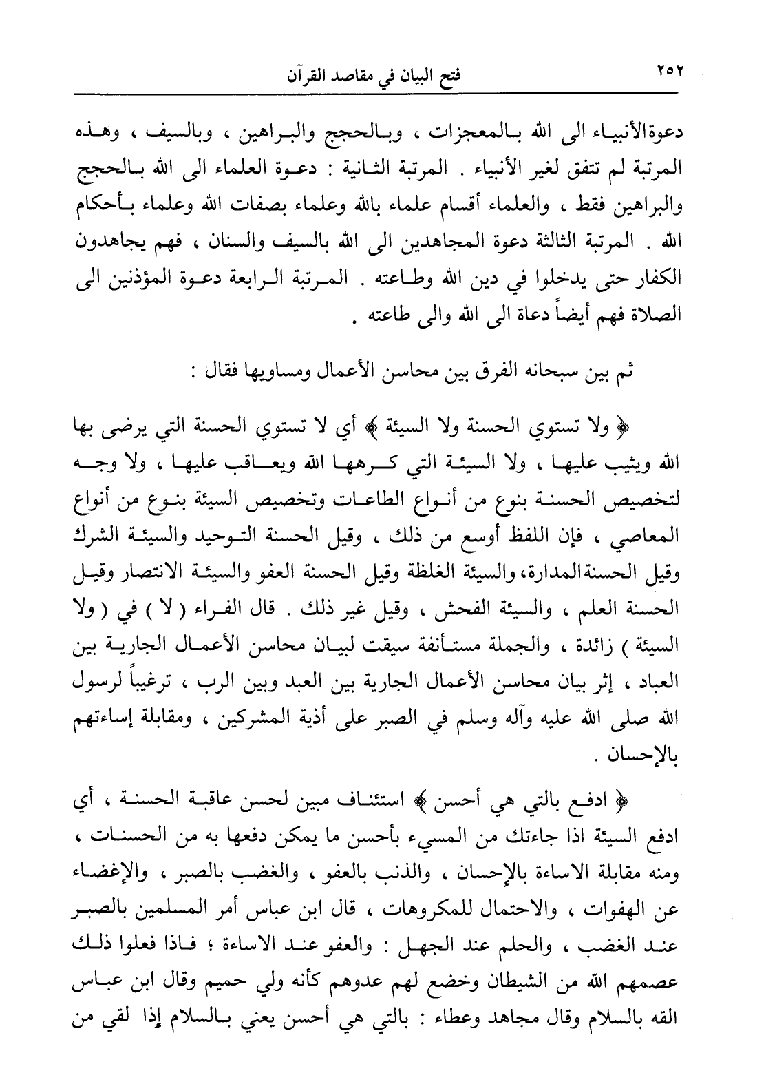 (ولا تستوي الحسنة ولا السيئة) أي لا تستوي الحسنة التي يرضى بها الله ويثيب عليها، ولا السيئة التي كرهها الله ويعاقب عليها، ولا وجه لتخصيص الحسنة بنوع من أنواع الطاعات وتخصيص السيئة بنوع من أنواع المعاصي، فإن اللفظ أوسع من ذلك، وقيل الحسنة التوحيد والسيئة الشرك وقيل الحسنة المدارة، والسيئة الغلظة وقيل الحسنة العفو والسيئة الانتصار وقيل الحسنة العلم، والسيئة الفحش، وقيل غير ذلك. قال الفراء (لا) في (ولا السيئة) زائدة، والجملة مستأنفة سيقت لبيان محاسن الأعمال الجارية بين العباد، إثر بيان محاسن الأعمال الجارية بين العبد وبين الرب، ترغيباً لرسول الله صلى الله عليه وآله وسلم في الصبر على أذية المشركين، ومقابلة إساءتهم بالإحسان.