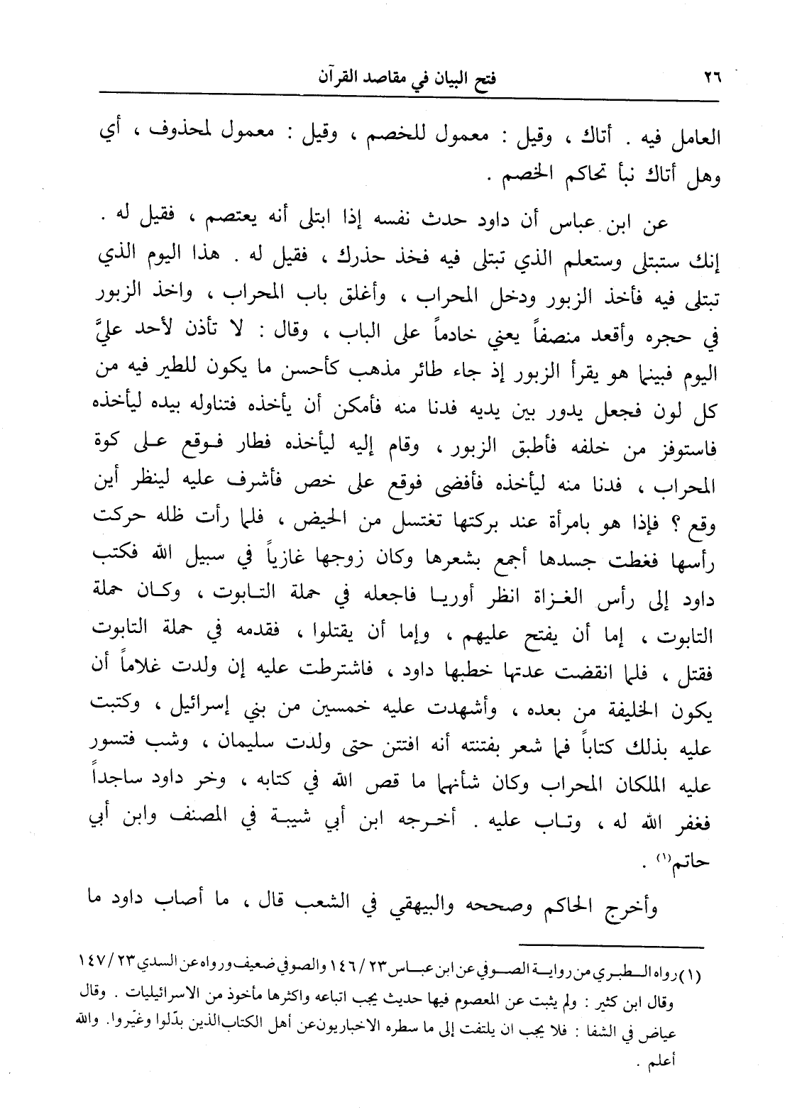 عن ابن عباس أن داود حدث نفسه إذا ابتلى أنه يعتصم، فقيل له: إنك ستبتلى وستعلم الذي تبتلى فيه فخذ حذرك، فقيل له. هذا اليوم الذي تبتلى فيه فأخذ الزبور ودخل المحراب، وأغلق باب المحراب، وأخذ الزبور في حجره وأقعد منصفاً يعني خادماً على الباب، وقال: لا تأذن لأحد عليَّ اليوم فبينما هو يقرأ الزبور إذ جاء طائر مذهب كأحسن ما يكون للطير فيه من كل لون فجعل يدور بين يديه فدنا منه فأمكن أن يأخذه فتناوله بيده ليأخذه فاستوفز من خلفه فأطبق الزبور، وقام إليه ليأخذه فطار فوقع على كوة المحراب، فدنا منه ليأخذه فأفضى فوقع على خص فأشرف عليه لينظر أين وقع؟ فإذا هو بامرأة عند بركتها تغتسل من الحيض، فلما رأت ظله حركت رأسها فغطت جسدها أجمع بشعرها وكان زوجها غازياً في سبيل الله فكتب داود إلى رأس الغزاة انظر أوريا فاجعله في حملة التابوت، وكان حملة التابوت، إما أن يفتح عليهم، وإما أن يقتلوا، فقدمه في حملة التابوت فقتل، فلما انقضت عدتها خطبها داود، فاشترطت عليه إن ولدت غلاماً أن يكون الخليفة من بعده، وأشهدت عليه خمسين من بني إسرائيل، وكتبت عليه بذلك كتاباً فما شعر بفتنته أنه افتتن حتى ولدت سليمان، وشب فتسور عليه الملكان المحراب وكان شأنهما ما قص الله في كتابه، وخر داود ساجداً فغفر الله له، وتاب عليه. أخرجه ابن أبي شيبة في المصنف وابن أبي حاتم (¬1).