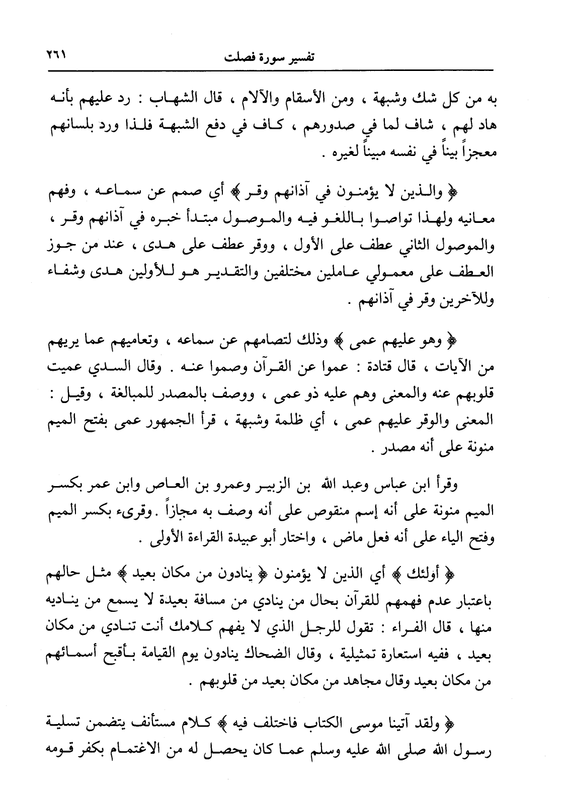 (والذين لا يؤمنون في آذانهم وقر) أي صمم عن سماعه، وفهم معانيه ولهذا تواصوا باللغو فيه والموصول مبتدأ خبره في آذانهم وقر، والموصول الثاني عطف على الأول، ووقر عطف على هدى، عند من جوز العطف على معمولي عاملين مختلفين والتقدير هو للأولين هدى وشفاء وللآخرين وقر في آذانهم.