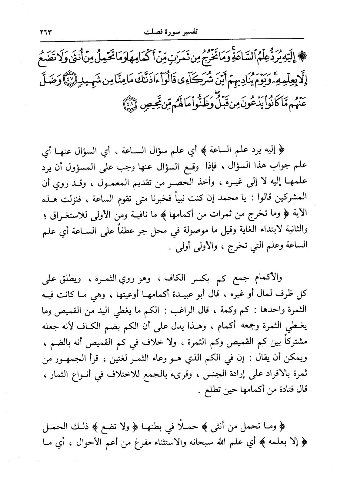إِلَيْهِ يُرَدُّ عِلْمُ السَّاعَةِ وَمَا تَخْرُجُ مِنْ ثَمَرَاتٍ مِنْ أَكْمَامِهَا وَمَا تَحْمِلُ مِنْ أُنْثَى وَلَا تَضَعُ إِلَّا بِعِلْمِهِ وَيَوْمَ يُنَادِيهِمْ أَيْنَ شُرَكَائِي قَالُوا آذَنَّاكَ مَا مِنَّا مِنْ شَهِيدٍ (47) وَضَلَّ عَنْهُمْ مَا كَانُوا يَدْعُونَ مِنْ قَبْلُ وَظَنُّوا مَا لَهُمْ مِنْ مَحِيصٍ (48)