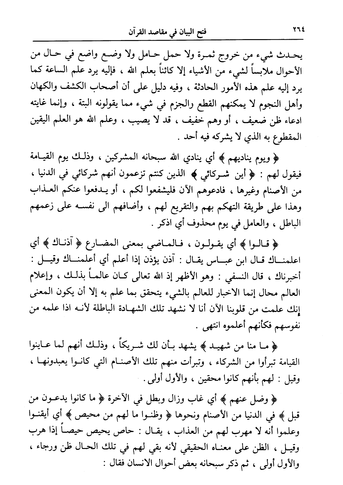 يحدث شيء من خروج ثمرة ولا حمل حامل ولا وضع واضع في حال من الأحوال ملابساً لشيء من الأشياء إلا كائناً بعلم الله، فإليه يرد علم الساعة كما يرد إليه علم هذه الأمور الحادثة، وفيه دليل على أن أصحاب الكشف والكهان وأهل النجوم لا يمكنهم القطع والجزم في شيء مما يقولونه البتة، وإنما غايته ادعاء ظن ضعيف، أو وهم خفيف، قد لا يصيب، وعلم الله هو العلم اليقين المقطوع به الذي لا يشركه فيه أحد.