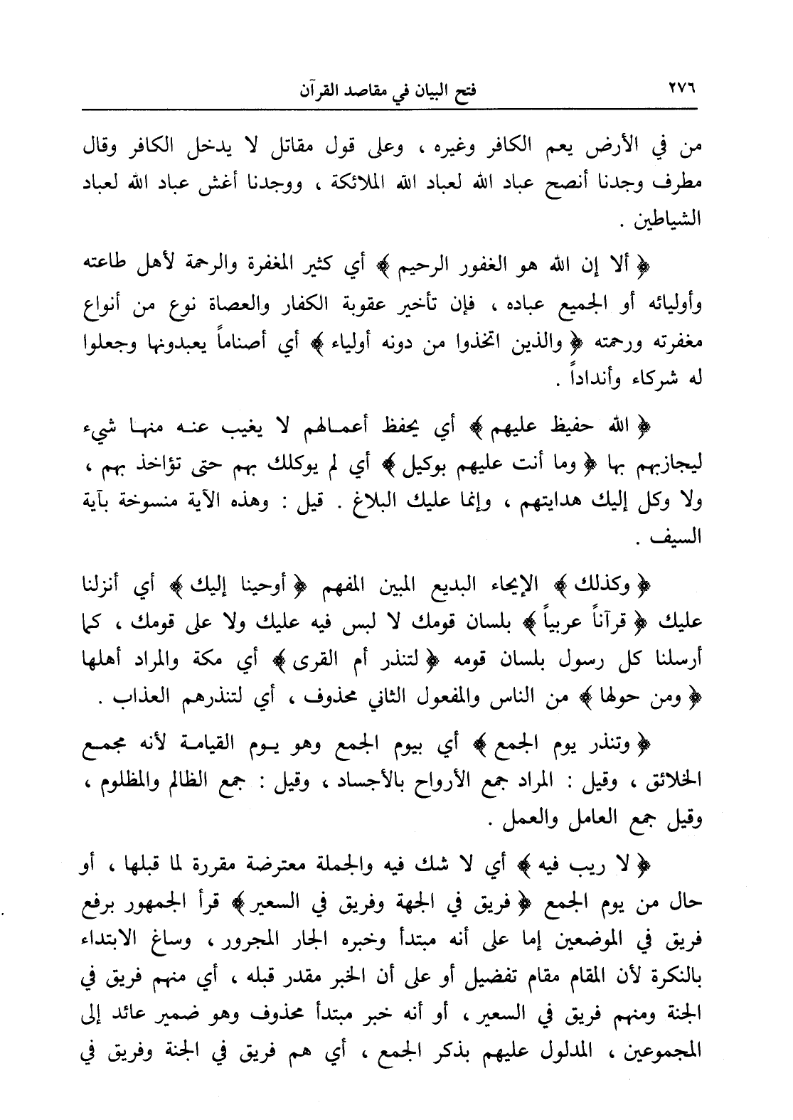 (وتنذر يوم الجمع) أي بيوم الجمع وهو يوم القيامة لأنه مجمع الخلائق، وقيل: المراد جمع الأرواح بالأجساد، وقيل: جمع الظالم والمظلوم، وقيل جمع العامل والعمل.