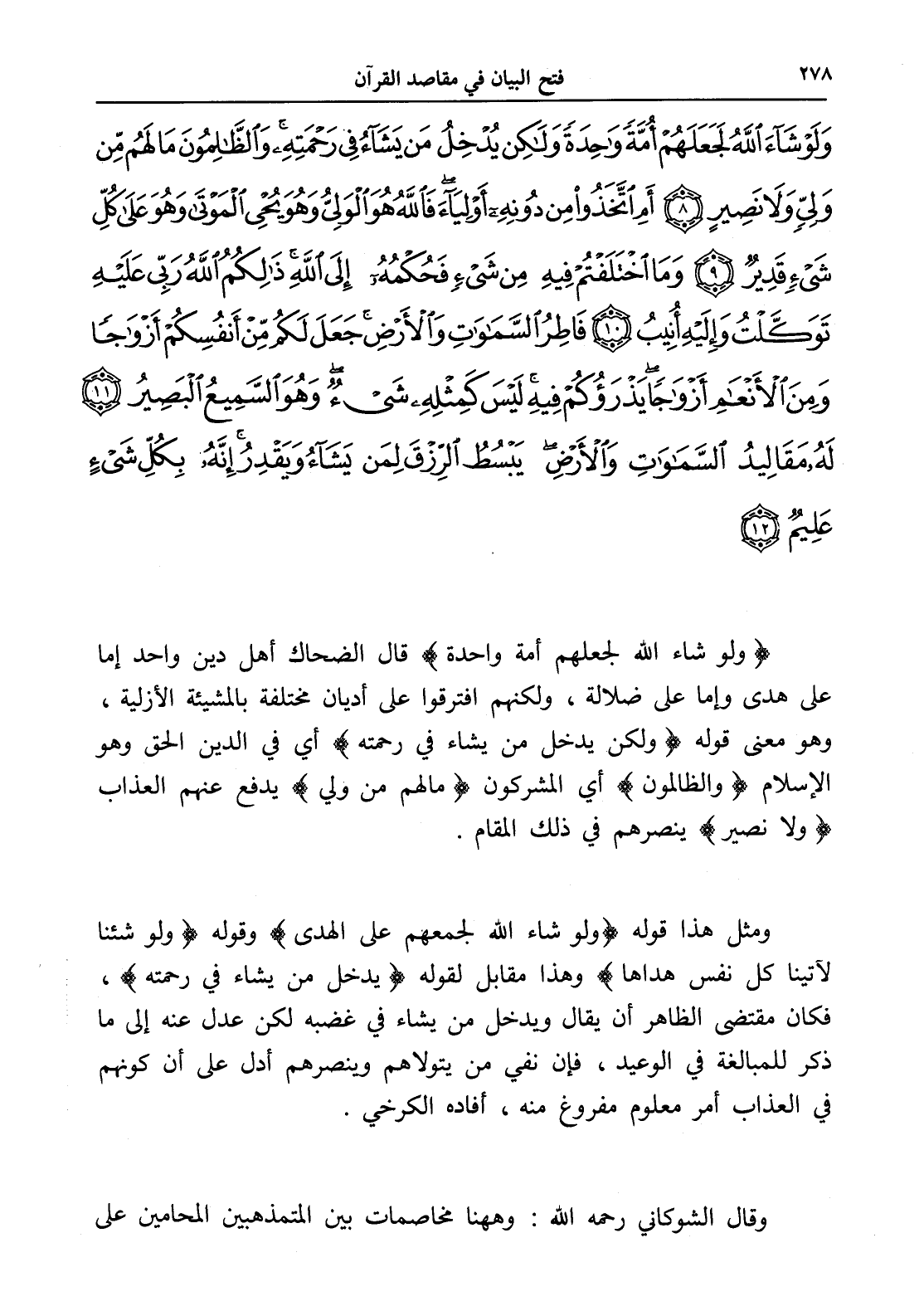وَلَوْ شَاءَ اللَّهُ لَجَعَلَهُمْ أُمَّةً وَاحِدَةً وَلَكِنْ يُدْخِلُ مَنْ يَشَاءُ فِي رَحْمَتِهِ وَالظَّالِمُونَ مَا لَهُمْ مِنْ وَلِيٍّ وَلَا نَصِيرٍ (8) أَمِ اتَّخَذُوا مِنْ دُونِهِ أَوْلِيَاءَ فَاللَّهُ هُوَ الْوَلِيُّ وَهُوَ يُحْيِ الْمَوْتَى وَهُوَ عَلَى كُلِّ شَيْءٍ قَدِيرٌ (9) وَمَا اخْتَلَفْتُمْ فِيهِ مِنْ شَيْءٍ فَحُكْمُهُ إِلَى اللَّهِ ذَلِكُمُ اللَّهُ رَبِّي عَلَيْهِ تَوَكَّلْتُ وَإِلَيْهِ أُنِيبُ (10) فَاطِرُ السَّمَاوَاتِ وَالْأَرْضِ جَعَلَ لَكُمْ مِنْ أَنْفُسِكُمْ أَزْوَاجًا وَمِنَ الْأَنْعَامِ أَزْوَاجًا يَذْرَؤُكُمْ فِيهِ لَيْسَ كَمِثْلِهِ شَيْءٌ وَهُوَ السَّمِيعُ الْبَصِيرُ (11) لَهُ مَقَالِيدُ السَّمَاوَاتِ وَالْأَرْضِ يَبْسُطُ الرِّزْقَ لِمَنْ يَشَاءُ وَيَقْدِرُ إِنَّهُ بِكُلِّ شَيْءٍ عَلِيمٌ (12)
