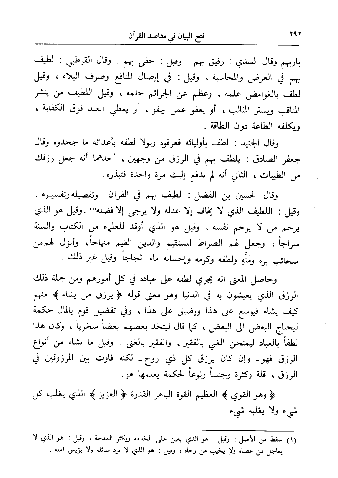بار بهم وقال السدي: رفيق بهم وقيل: حفى بهم. وقال القرطبي: لطيف بهم في العرض والمحاسبة، وقيل: في إيصال المنافع وصرف البلاء، وقيل لطف بالغوامض علمه، وعظم عن الجرائم حلمه، وقيل اللطيف من ينشر المناقب ويستر المثالب، أو يعفو عمن يهفو، أو يعطي العبد فوق الكفاية، ويكلفه الطاعة دون الطاقة.