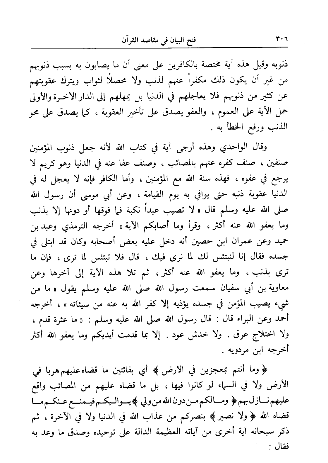 وقال الواحدي وهذه أرجى آية في كتاب الله لأنه جعل ذنوب المؤمنين صنفين، صنف كفره عنهم بالمصائب، وصنف عفا عنه في الدنيا وهو كريم لا يرجع في عفوه، فهذه سنة الله مع المؤمنين، وأما الكافر فإنه لا يعجل له في الدنيا عقوبة ذنبه حتى يوافي به يوم القيامة، وعن أبي موسى أن رسول الله صلى الله عليه وسلم قال " لا تصيب عبداً نكبة فما فوقها أو دونها إلا بذنب وما يعفو الله عنه أكثر، وقرأ وما أصابكم الآية " أخرجه الترمذي وعبد بن حميد وعن عمران ابن حصين أنه دخل عليه بعض أصحابه وكان قد ابتلى في جسده فقال إنا لنبتئس لك لما نرى فيك، قال فلا تبتئس لما ترى، فإن ما ترى بذنب، وما يعفو الله عنه أكثر، ثم تلا هذه الآية إلى آخرها وعن معاوية بن أبي سفيان سمعت رسول الله صلى الله عليه وسلم يقول " ما من شيء يصيب المؤمن في جسده يؤذيه إلا كفر الله به عنه من سيئاته "، أخرجه أحمد وعن البراء قال: قال رسول الله صلى الله عليه وسلم: " ما عثرة قدم، ولا اختلاج عرق، ولا خدش عود، إلا بما قدمت أيديكم وما يعفو الله أكثر " أخرجه ابن مردويه.