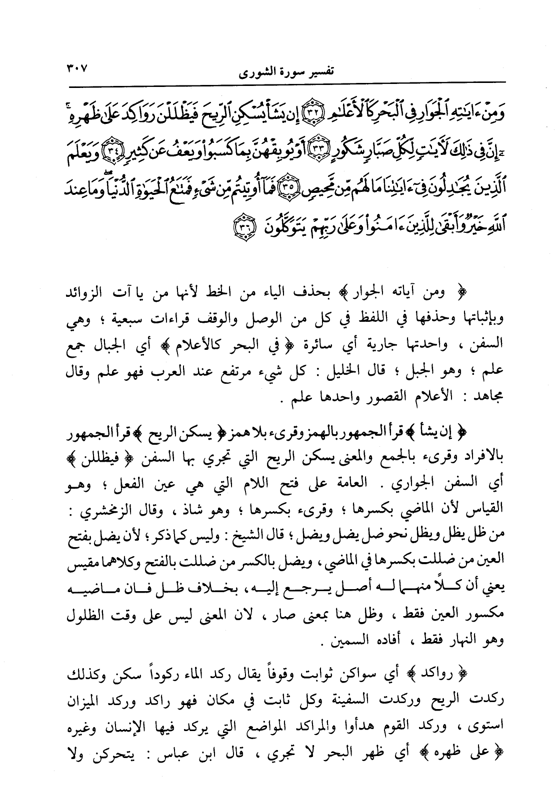 وَمِنْ آيَاتِهِ الْجَوَارِ فِي الْبَحْرِ كَالْأَعْلَامِ (32) إِنْ يَشَأْ يُسْكِنِ الرِّيحَ فَيَظْلَلْنَ رَوَاكِدَ عَلَى ظَهْرِهِ إِنَّ فِي ذَلِكَ لَآيَاتٍ لِكُلِّ صَبَّارٍ شَكُورٍ (33) أَوْ يُوبِقْهُنَّ بِمَا كَسَبُوا وَيَعْفُ عَنْ كَثِيرٍ (34) وَيَعْلَمَ الَّذِينَ يُجَادِلُونَ فِي آيَاتِنَا مَا لَهُمْ مِنْ مَحِيصٍ (35) فَمَا أُوتِيتُمْ مِنْ شَيْءٍ فَمَتَاعُ الْحَيَاةِ الدُّنْيَا وَمَا عِنْدَ اللَّهِ خَيْرٌ وَأَبْقَى لِلَّذِينَ آمَنُوا وَعَلَى رَبِّهِمْ يَتَوَكَّلُونَ (36)