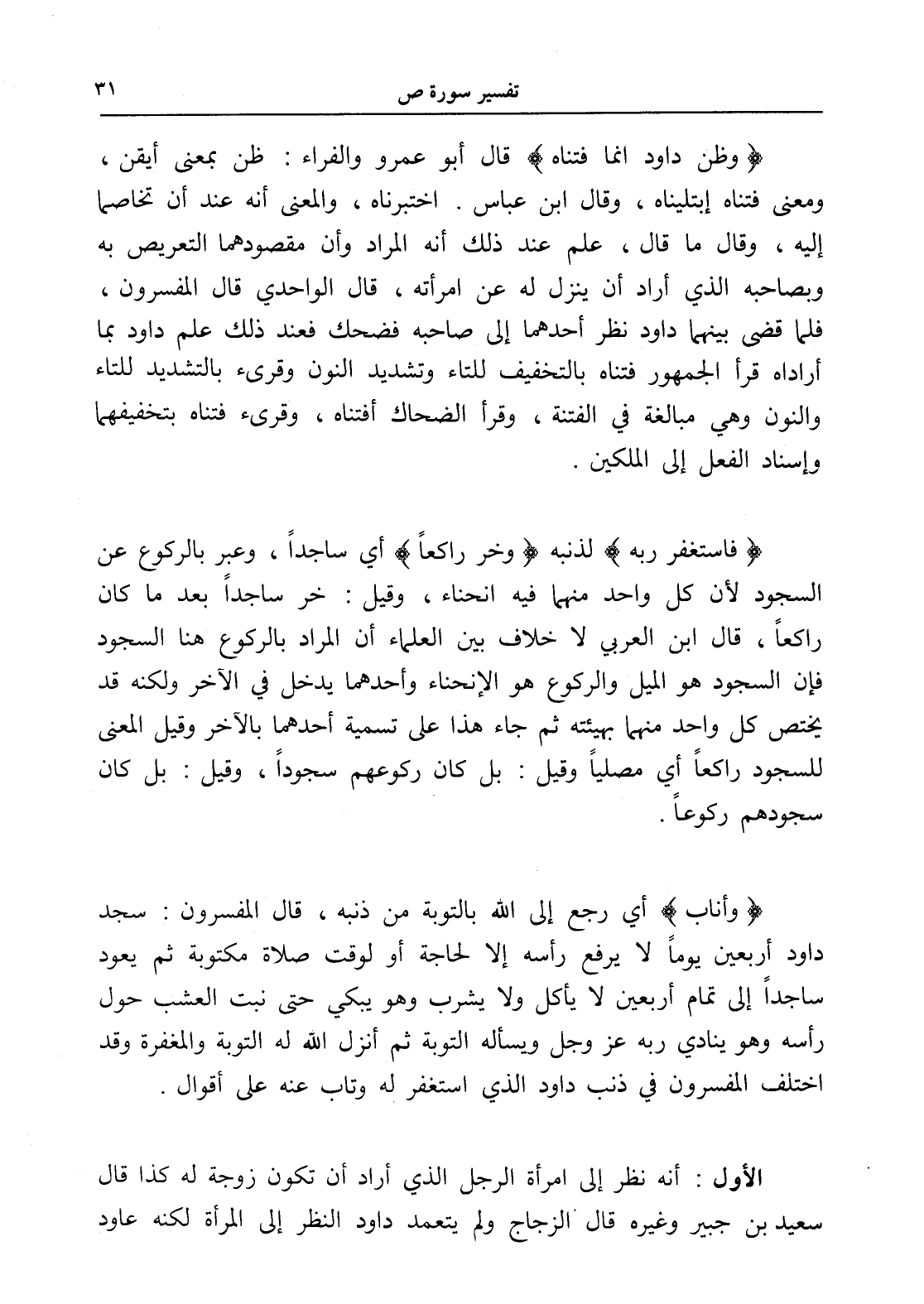 (وأناب) أي رجع إلى الله بالتوبة من ذنبه، قال المفسرون: سجد داود أربعين يوماً لا يرفع رأسه إلا لحاجة أو لوقت صلاة مكتوبة ثم يعود ساجداً إلى تمام أربعين لا يأكل ولا يشرب وهو يبكي حتى نبت العشب حول رأسه وهو ينادي ربه عز وجل ويسأله التوبة ثم أنزل الله له التوبة والمغفرة وقد اختلف المفسرون في ذنب داود الذي استغفر له وتاب عنه على أقوال.