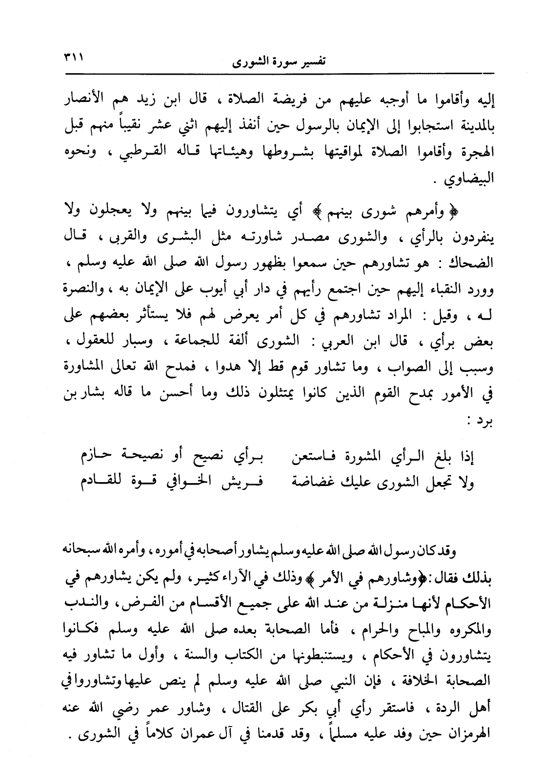 (وأمرهم شورى بينهم) أي يتشاورون فيما بينهم ولا يعجلون ولا ينفردون بالرأي، والشورى مصدر شاورته مثل البشرى والقربى، قال الضحاك: هو تشاورهم حين سمعوا بظهور رسول الله صلى الله عليه وسلم، وورد النقباء إليهم حين اجتمع رأيهم في دار أبي أيوب على الإيمان به، والنصرة له، وقيل: المراد تشاورهم في كل أمر يعرض لهم فلا يستأثر بعضهم على بعض برأي، قال ابن العربي: الشورى ألفة للجماعة، وسبار للعقول، وسبب إلى الصواب، وما تشاور قوم قط إلا هدوا، فمدح الله تعالى المشاورة في الأمور بمدح القوم الذين كانوا يمتثلون ذلك وما أحسن ما قاله بشار بن برد:
