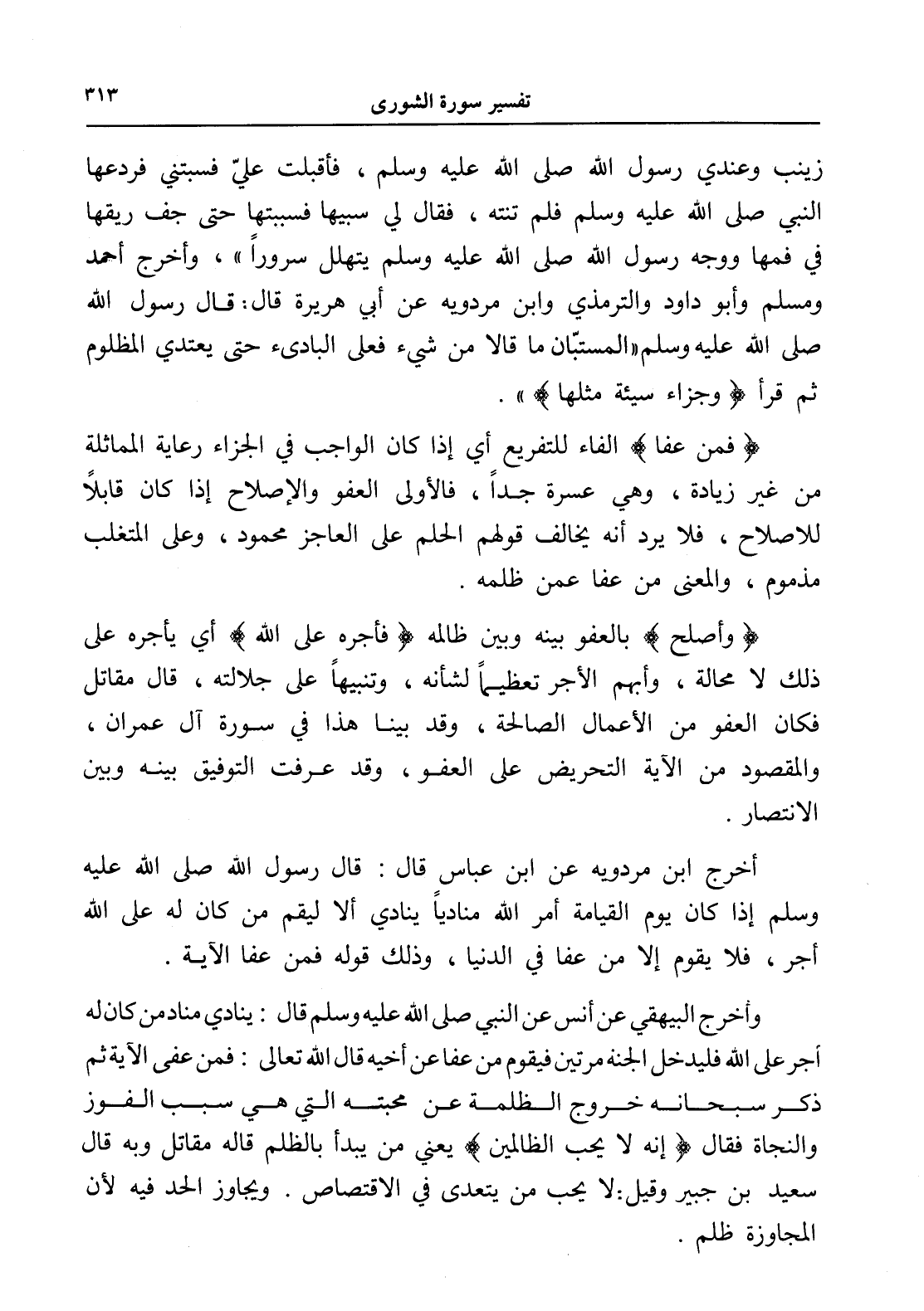 زينب وعندي رسول الله صلى الله عليه وسلم، فأقبلت عليّ فسبتني فردعها النبي صلى الله عليه وسلم فلم تنته، فقال لي سبيها فسببتها حتى جف ريقها في فمها ووجه رسول الله صلى الله عليه وسلم يتهلل سروراً "، وأخرج أحمد ومسلم وأبو داود والترمذي وابن مردويه عن أبي هريرة قال: قال رسول الله صلى الله عليه وسلم " المستبّان ما قالا من شيء فعلى البادىء حتى يعتدي المظلوم ثم قرأ (وجزاء سيئة مثلها) ".