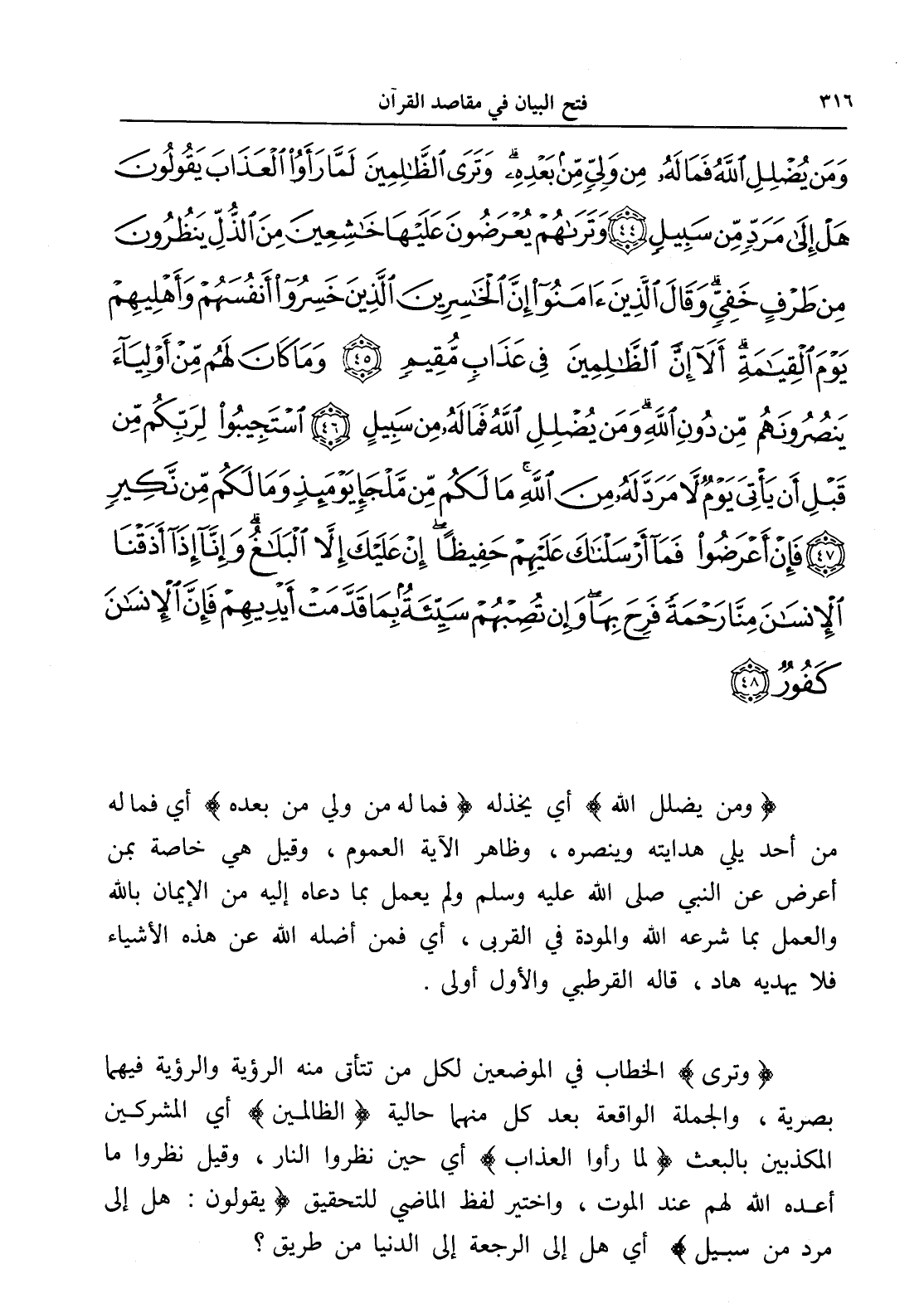 وَمَنْ يُضْلِلِ اللَّهُ فَمَا لَهُ مِنْ وَلِيٍّ مِنْ بَعْدِهِ وَتَرَى الظَّالِمِينَ لَمَّا رَأَوُا الْعَذَابَ يَقُولُونَ هَلْ إِلَى مَرَدٍّ مِنْ سَبِيلٍ (44) وَتَرَاهُمْ يُعْرَضُونَ عَلَيْهَا خَاشِعِينَ مِنَ الذُّلِّ يَنْظُرُونَ مِنْ طَرْفٍ خَفِيٍّ وَقَالَ الَّذِينَ آمَنُوا إِنَّ الْخَاسِرِينَ الَّذِينَ خَسِرُوا أَنْفُسَهُمْ وَأَهْلِيهِمْ يَوْمَ الْقِيَامَةِ أَلَا إِنَّ الظَّالِمِينَ فِي عَذَابٍ مُقِيمٍ (45) وَمَا كَانَ لَهُمْ مِنْ أَوْلِيَاءَ يَنْصُرُونَهُمْ مِنْ دُونِ اللَّهِ وَمَنْ يُضْلِلِ اللَّهُ فَمَا لَهُ مِنْ سَبِيلٍ (46) اسْتَجِيبُوا لِرَبِّكُمْ مِنْ قَبْلِ أَنْ يَأْتِيَ يَوْمٌ لَا مَرَدَّ لَهُ مِنَ اللَّهِ مَا لَكُمْ مِنْ مَلْجَإٍ يَوْمَئِذٍ وَمَا لَكُمْ مِنْ نَكِيرٍ (47) فَإِنْ أَعْرَضُوا فَمَا أَرْسَلْنَاكَ عَلَيْهِمْ حَفِيظًا إِنْ عَلَيْكَ إِلَّا الْبَلَاغُ وَإِنَّا إِذَا أَذَقْنَا الْإِنْسَانَ مِنَّا رَحْمَةً فَرِحَ بِهَا وَإِنْ تُصِبْهُمْ سَيِّئَةٌ بِمَا قَدَّمَتْ أَيْدِيهِمْ فَإِنَّ الْإِنْسَانَ كَفُورٌ (48)