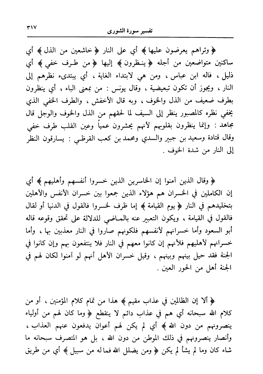 (وتراهم يعرضون عليها) أي على النار (خاشعين من الذل) أي ساكنين متواضعين من أجله (ينظرون) إليها (من طرف خفي) أي ذليل، قاله ابن عباس، ومن هي لابتداء الغاية، أي يبتدىء نظرهم إلى النار، ويجوز أن تكون تبعيضية، وقال يونس: من بمعنى الباء، أي ينظرون بطرف ضعيف من الذل والخوف، وبه قال الأخفش، والطرف الخفي الذي يخفي نظره كالمصبور ينظر إلى السيف لما لحقهم من الذل والخوف والوجل قال مجاهد: وإنما ينظرون بقلوبهم لأنهم يحشرون عمياً وعين القلب طرف خفي وقال قتادة وسعيد بن جبير والسدي ومحمد بن كعب القرظي: يسارقون النظر إلى النار من شدة الخوف.