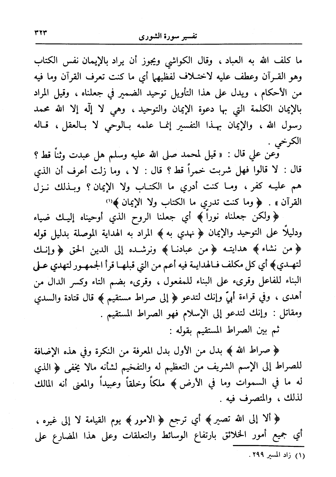 ما كلف الله به العباد، وقال الكواشي ويجوز أن يراد بالإيمان نفس الكتاب وهو القرآن وعطف عليه لاختلاف لفظيهما أي ما كنت تعرف القرآن وما فيه من الأحكام، ويدل على هذا التأويل توحيد الضمير في جعلناه، وقيل المراد بالإيمان الكلمة التي بها دعوة الإيمان والتوحيد، وهي لا إله إلا الله محمد رسول الله، والإيمان بهذا التفسير إنما علمه بالوحي لا بالعقل، قاله الكرخي.