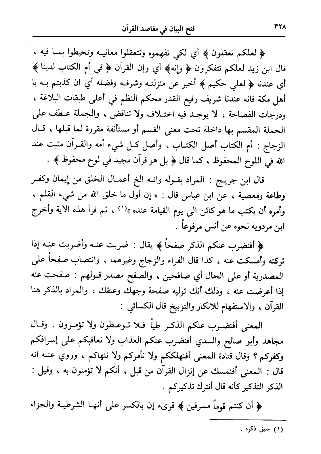 (أفنضرب عنكم الذكر صفحاً) يقال: ضربت عنه وأضربت عنه إذا تركته وأمسكت عنه، كذا قال الفراء والزجاج وغيرهما، وانتصاب صفحاً على المصدرية أو على الحال أي صافحين، والصفح مصدر قولهم: صفحت عنه إذا أعرضت عنه، وذلك أنك توليه صفحة وجهك وعنقك، والمراد بالذكر هنا القرآن، والاستفهام للإنكار والتوبيخ قال الكسائي: