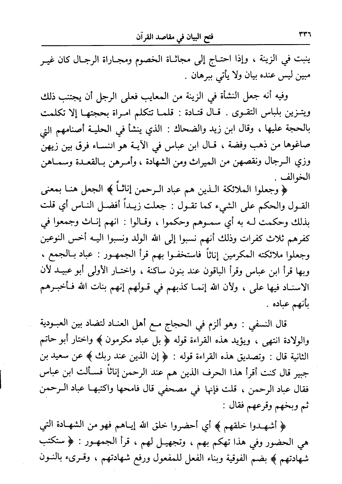 قال النسفي: وهو ألزم في الحجاج مع أهل العناد لتضاد بين العبودية والولادة انتهى، ويؤيد هذه القراءة قوله (بَلْ عِبَادٌ مُكْرَمُونَ) واختار أبو حاتم الثانية قال: وتصديق هذه القراءة قوله: (إِنَّ الَّذِينَ عِنْدَ رَبِّكَ) عن سعيد بن جبير قال كنت أقرأ هذا الحرف الذين هم عند الرحمن إناثاً فسألت ابن عباس فقال عباد الرحمن، قلت فإنها في مصحفي قال فامحها واكتبها عباد الرحمن ثم وبخهم وقرعهم فقال: