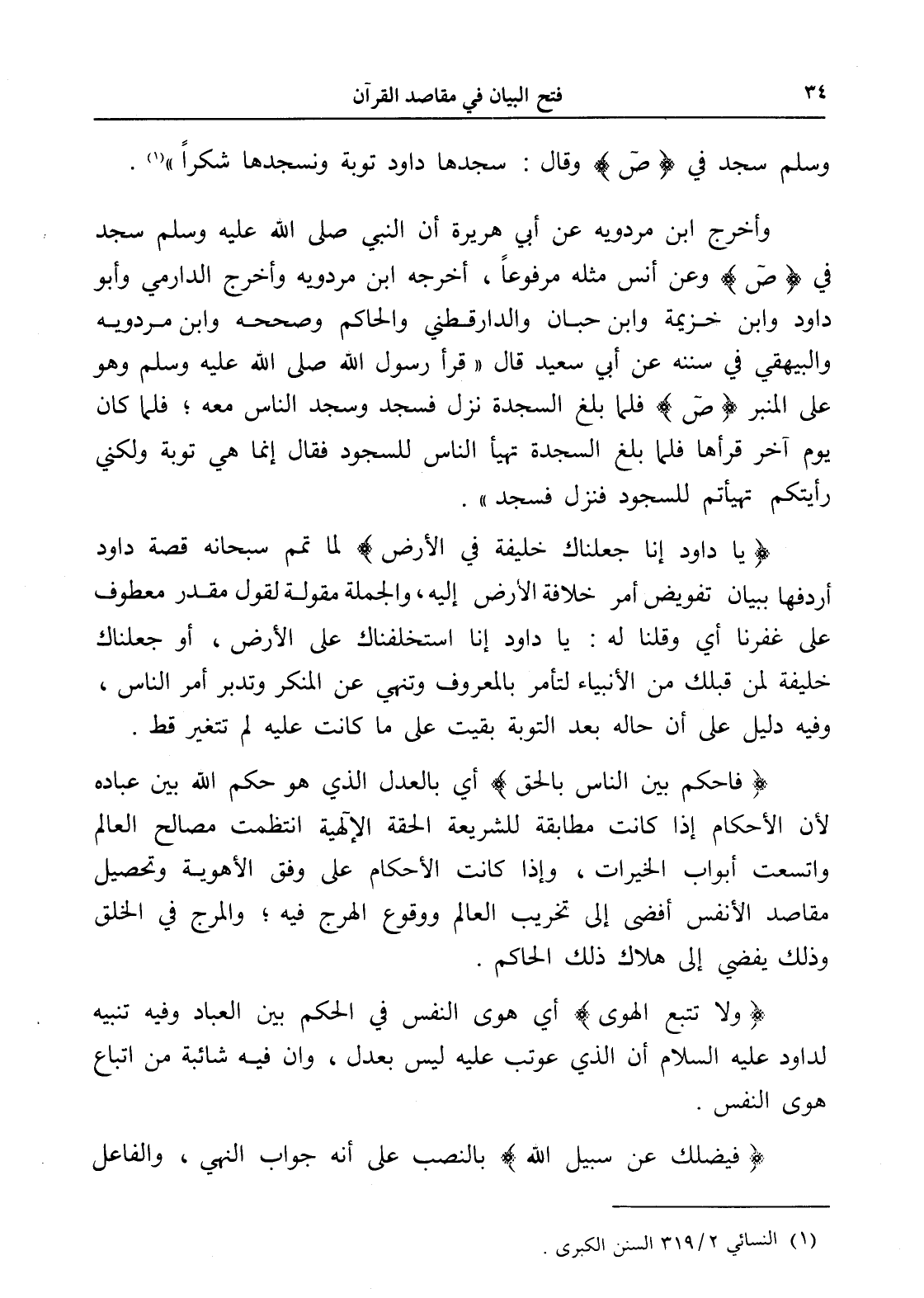 وأخرج ابن مردويه عن أبي هريرة أن النبي صلى الله عليه وسلم سجد في (ص) وعن أنس مثله مرفوعاً، أخرجه ابن مردويه وأخرج الدارمي وأبو داود وابن خزيمة وابن حبان والدارقطني والحاكم وصححه وابن مردويه والبيهقي في سننه عن أبي سعيد قال " قرأ رسول الله صلى الله عليه وسلم وهو على المنبر (ص) فلما بلغ السجدة نزل فسجد وسجد الناس معه؛ فلما كان يوم آخر قرأها فلما بلغ السجدة تهيأ الناس للسجود فقال إنما هي توبة ولكني رأيتكم تهيأتم للسجود فنزل فسجد ".