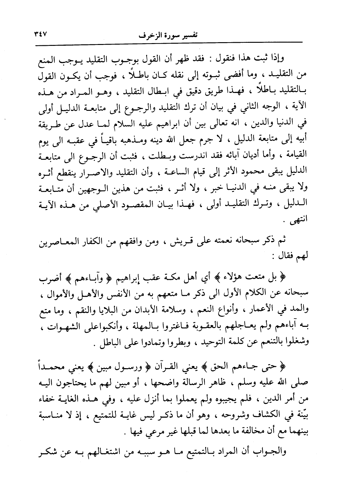 وإذا ثبت هذا فنقول: فقد ظهر أن القول بوجوب التقليد يوجب المنع من التقليد، وما أفضى ثبوته إلى نقله كان باطلاً، فوجب أن يكون القول بالتقليد باطلاً، فهذا طريق دقيق في إبطال التقليد، وهو المراد من هذه الآية، الوجه الثاني في بيان أن ترك التقليد والرجوع إلى متابعة الدليل أولى في الدنيا والدين، أنه تعالى بين أن إبراهيم عليه السلام لما عدل عن طريقة أبيه إلى متابعة الدليل، لا جرم جعل الله دينه ومذهبه باقياً في عقبه إلى يوم القيامة، وأما أديان آبائه فقد اندرست وبطلت، فثبت أن الرجوع إلى متابعة الدليل يبقى محمود الأثر إلى قيام الساعة، وأن التقليد والإصرار ينقطع أثره ولا يبقى منه في الدنيا خبر، ولا أثر، فثبت من هذين الوجهين أن متابعة الدليل، وترك التقليد أولى، فهذا بيان المقصود الأصلي من هذه الآية انتهى.