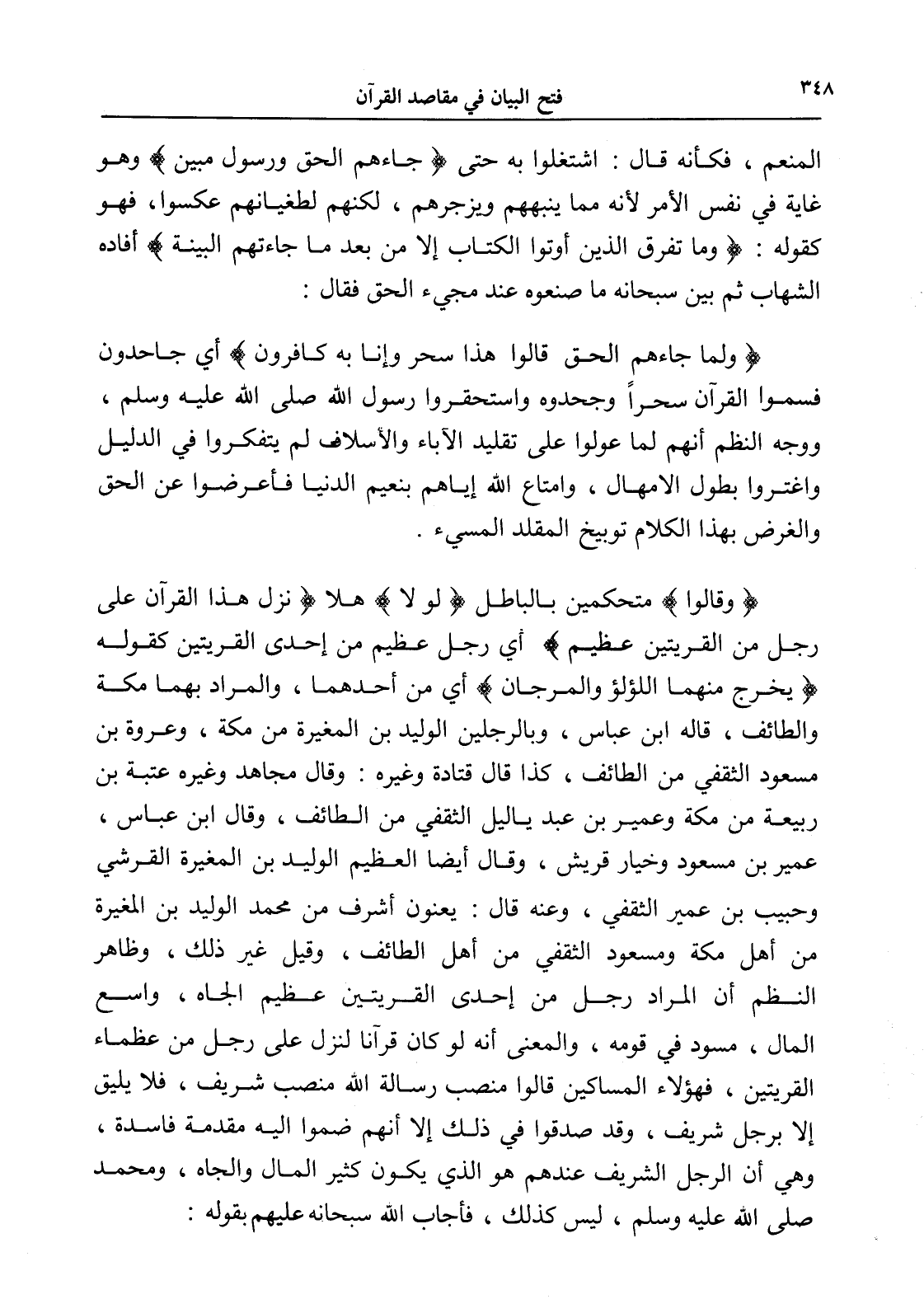 (وقالوا) متحكمين بالباطل (لولا) هلا (نزل هذا القرآن على رجل من القريتين عظيم) أي رجل عظيم من إحدى القريتين كقوله (يخرج منهما اللؤلؤ والمرجان) أي من أحدهما، والمراد بهما مكة والطائف، قاله ابن عباس، وبالرجلين الوليد بن المغيرة من مكة، وعروة بن مسعود الثقفي من الطائف، كذا قال قتادة وغيره: وقال مجاهد وغيره عتبة بن ربيعة من مكة وعمير بن عبد ياليل الثقفي من الطائف، وقال ابن عباس، عمير بن مسعود وخيار قريش، وقال أيضاً العظيم الوليد بن المغيرة القرشي وحبيب بن عمير الثقفي، وعنه قال: يعنون أشرف من محمد الوليد بن المغيرة من أهل مكة ومسعود الثقفي من أهل الطائف، وقيل غير ذلك، وظاهر النظم أن المراد رجل من إحدى القريتين عظيم الجاه، واسع المال، مسود في قومه، والمعنى أنه لو كان قرآنا لنزل على رجل من عظماء القريتين، فهؤلاء المساكين قالوا منصب رسالة الله منصب شريف، فلا يليق إلا برجل شريف، وقد صدقوا في ذلك إلا أنهم ضموا إليه مقدمة فاسدة، وهي أن الرجل الشريف عندهم هو الذي يكون كثير المال والجاه، ومحمد صلى الله عليه وسلم، ليس كذلك، فأجاب الله سبحانه عليهم بقوله: