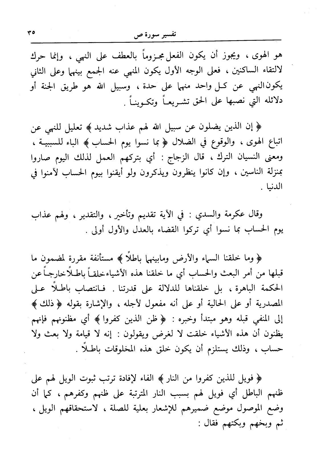 (وما خلقنا السماء والأرض وما بينهما باطلاً) مستأنفة مقررة لمضمون ما قبلها من أمر البعث والحساب أي ما خلقنا هذه الأشياء خلقاً باطلاً خارجاً عن الحكمة الباهرة، بل خلقناها للدلالة على قدرتنا. فانتصاب باطلاً على المصدرية أو على الحالية أو على أنه مفعول لأجله، والإشارة بقوله (ذلك) إلى النفي قبله وهو مبتدأ وخبره: (ظن الذين كفروا) أي مظنونهم فإنهم يظنون أن هذه الأشياء خلقت لا لغرض ويقولون: إنه لا قيامة ولا بعث ولا حساب، وذلك يستلزم أن يكون خلق هذه المخلوقات باطلاً.