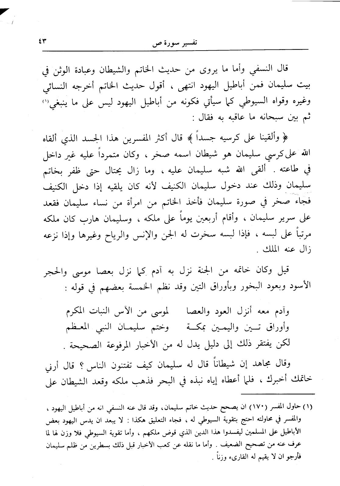 (¬1) حاول المفسر (170) أن يصحح حديث خاتم سليمان، وقد قال عنه النسفي إنه من أباطيل اليهود، والمفسر في محاولته احتج بتقوية السيوطي له، فجاء التعليق هكذا: لا يبعد أن يدس اليهود بعض الأباطيل على المسلمين ليفسدوا هذا الدين الذي قوض ملكهم، وأما تقوية السيوطي فلا وزن لها لما عرف عنه من تصحيح الضعيف. وأما ما نقله عن كعب الأخبار قبل ذلك بسطرين من ظلم سليمان فأرجو أن لا يقيم له القارىء وزناً.