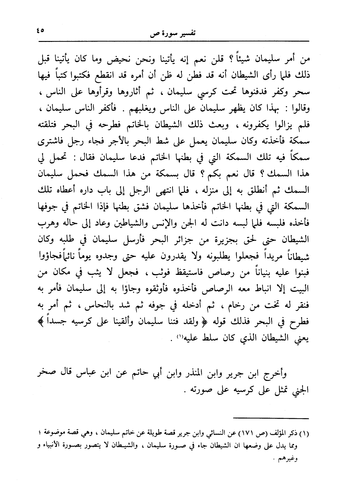 (¬1) ذكر المؤلف (ص 171) عن النسائي وابن جرير قصة طويلة عن خاتم سليمان، وهي قصة موضوعة؛ ومما يدل على وضعها أن الشيطان جاء في صورة سليمان، والشيطان لا يتصور بصورة الأنبياء ووغيرهم.