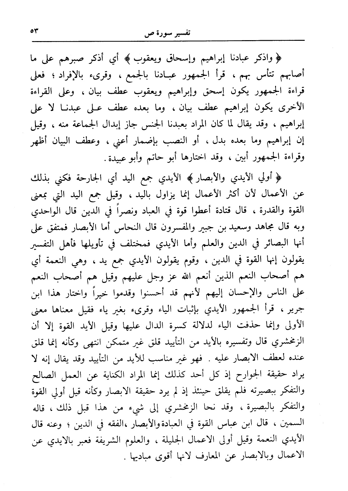 (أُولِي الْأَيْدِي وَالْأَبْصَارِ) الأيدي جمع اليد أي الجارحة فكني بذلك عن الأعمال لأن أكثر الأعمال إنما يزاول باليد، وقيل جمع اليد التي بمعنى القوة والقدرة، قال قتادة أعطوا قوة في العباد ونصراً في الدين قال الواحدي وبه قال مجاهد وسعيد بن جبير والمفسرون قال النحاس أما الأبصار فمتفق على أنها البصائر في الدين والعلم وأما الأيدي فمختلف في تأويلها فأهل التفسير يقولون إنها القوة في الدين، وقوم يقولون الأيدي جمع يد، وهي النعمة أي هم أصحاب النعم الذين أنعم الله عز وجل عليهم وقيل هم أصحاب النعم على الناس والإحسان إليهم لأنهم قد أحسنوا وقدموا خيراً واختار هذا ابن جرير، قرأ الجمهور الأيدي بإثبات الياء وقرىء بغير ياء فقيل معناها معنى الأولى وإنما حذفت الياء لدلالة كسرة الدال عليها وقيل الأيد القوة إلا أن الزمخشري قال وتفسيره بالأيد من التأييد قلق غير متمكن انتهى وكأنه إنما قلق عنده لعطف الابصار عليه. فهو غير مناسب للأيد من التأييد وقد يقال إنه لا يراد حقيقة الجوارح إذ كل أحد كذلك إنما المراد الكناية عن العمل الصالح والتفكر ببصيرته فلم يقلق حينئذ إذ لم يرد حقيقة الابصار وكأنه قيل أولي القوة والتفكر بالبصيرة، وقد نحا الزمخشري إلى شيء من هذا قبل ذلك، قاله السمين، قال ابن عباس القوة في العبادة والأبصار، الفقه في الدين؛ وعنه قال الأيدي النعمة وقيل أولى الأعمال الجليلة، والعلوم الشريفة فعبر بالأيدي عن الأعمال وبالابصار عن المعارف لأنها أقوى مباديها.